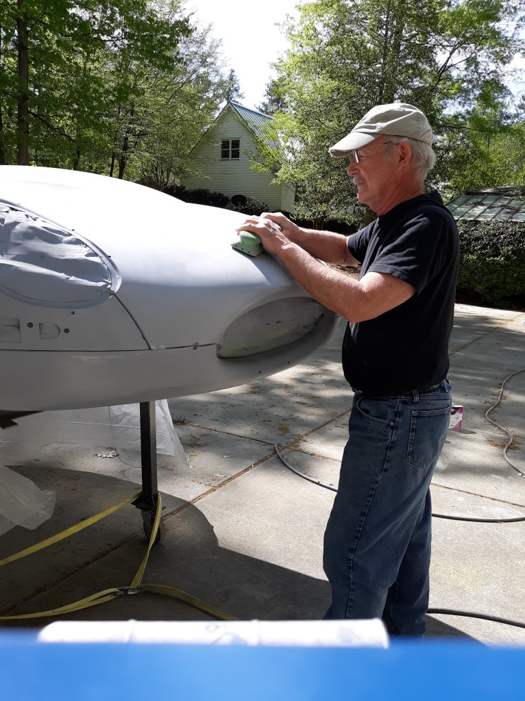 The way he coached me to approach this process was to apply a thin layer of body filler (I used 3M Platinum). The filler is shaped with special flexible sanding boards that I own, mounted with 80 grit paper. Initially, you sand about 90% of the filler back off (it makes an extreme mess) until spots of bare metal begin to show. These are your high spots. In some cases we were able to tap this down with a hammer. Eventually, more filler is added and you are getting into the fine tuning. For this step you apply a “guide coat” which is basically just inexpensive black spray paint or a black powder sold by 3M. As you sand, the low spots will remain black and the high spots will be wiped clear of paint. It gives you a very graphic image of what you are chasing. You finally reach a point where the paint is removed uniformly, with the goal of having high spots as bare metal. The next step is to spray on multiple coats of what is known as “high build” urethane primer. This product is easy to sand. You also use a guide coat with it but now you are sanding with 320 grit paper. Once the guide coat process reveals a smooth contoured surface, you finish up with 400 and 600 grit, using wet sanding. The resulting surface is basically ready for paint. It is easy to describe but, once again, the manhours can really build up as you work your way around the entire body.