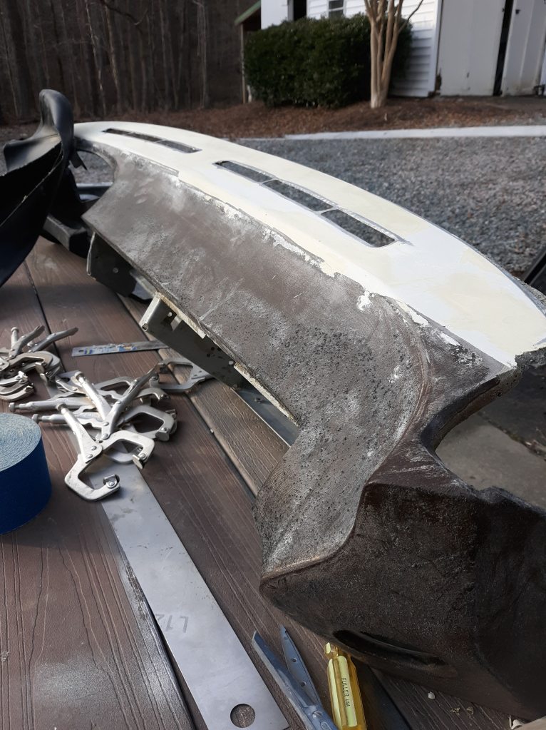 I decided to remove all of these materials and build up from scratch. I first carefully pulled away the leather. It is glued but was not hard to peel off. Then I used an abrasive disc to remove the material on the top, flattish portion of the dash. I stopped my removal roughly along the sewn seam of the leather dash. I experimented initially with spray-in expanding foam and felt it was too difficult to get a surface that would not telegraph imperfections to the leather. I then went with traditional body filler, which I am very comfortable working with. I built up the top surface to a nice smooth profile. I blended the body filler on the steeper slope of the dash back into the origional material.