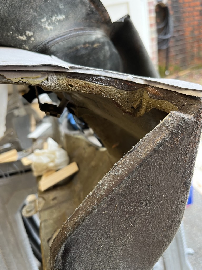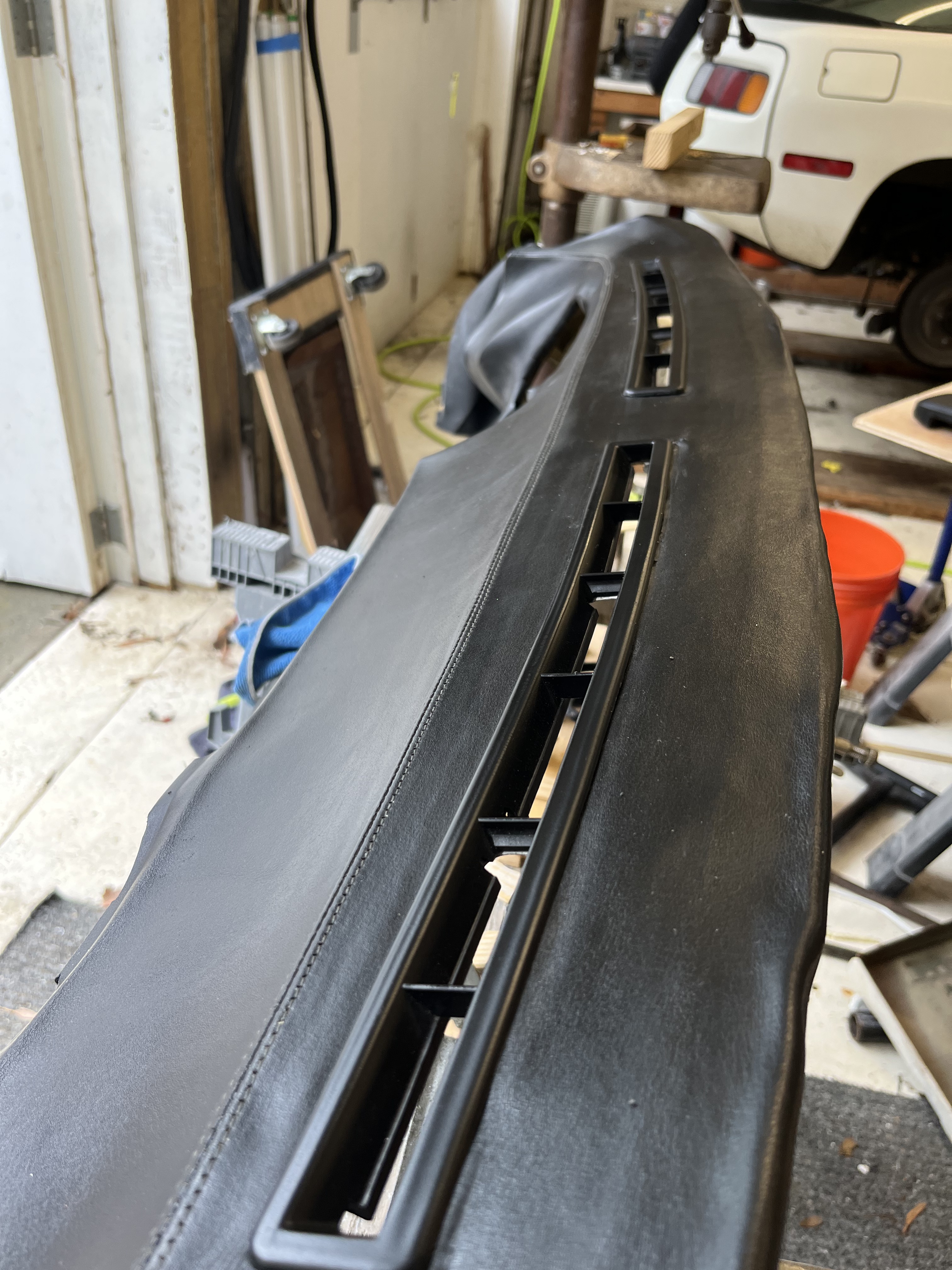 One issue I ran into. Early in project, I treated the leather with a rejuvination product, Leder Oel. The leather was really dry and I’m sure it benefited but I also feel that it compromised the adhesion of the contact cement. We’ll see what the long term results are. I will say that as I laid in the leather over the new surface, there was no lateral “tugging” required to place the leather in the correct position for the vents so that should help.