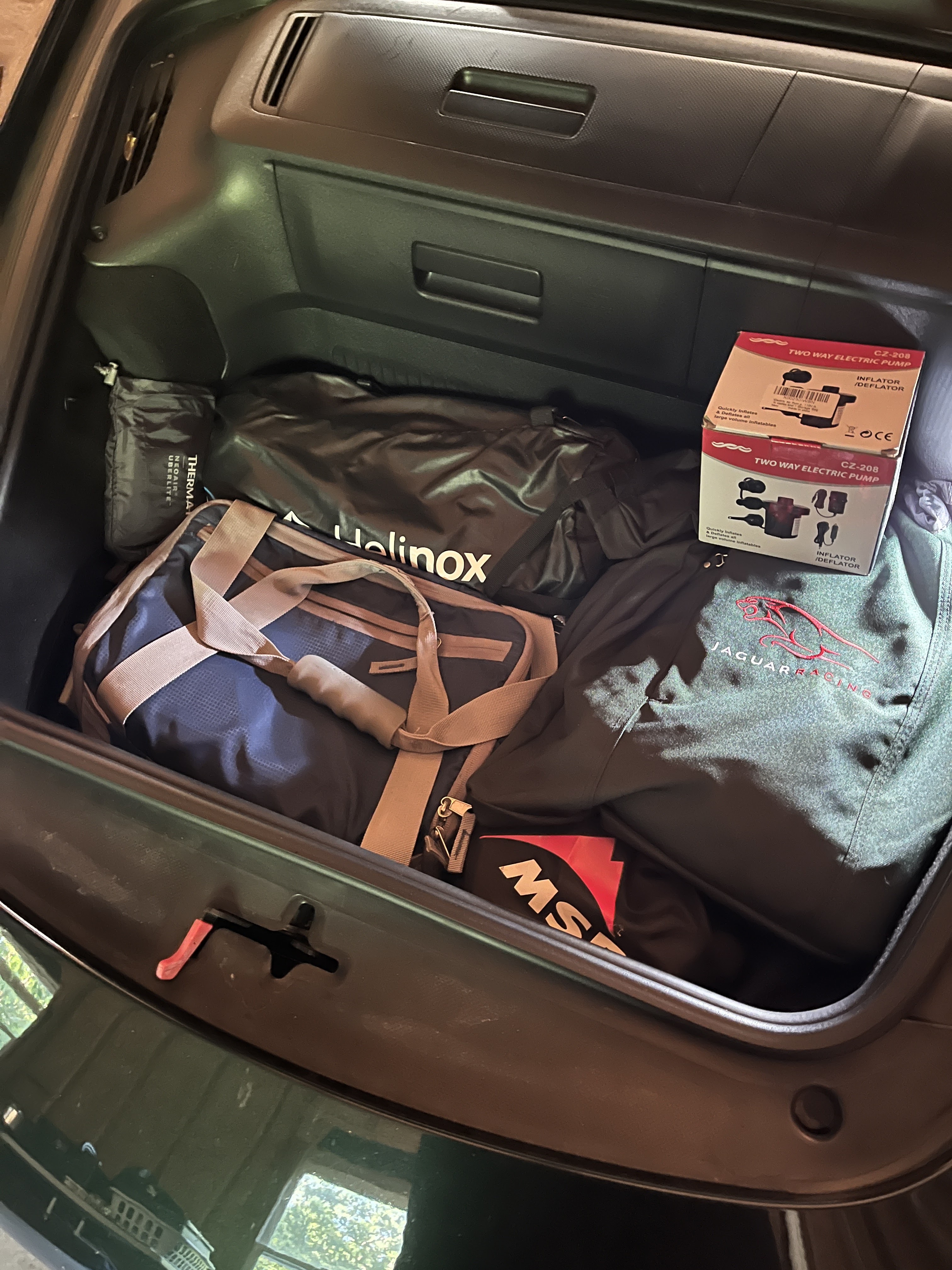 Although I plan to stay in motels I do like to have the option to camp, especially travelling down the PCH, where in the past I have found that lodging is scarce and expensive. Space is at a premium in the Cayman. During my LeMans trip I had perfected a low volume camping setup, basically backpacking gear, which includes a 2 man tent, sleeping bag, a cot, air mattress, a chair, a table, and a stove. All of this plus a small cooler and a 5 gallon water jug fit into the Cayman’s “frunk”. The passenger footwell held a roller bag and two small rucksacks. The rear cargo area was organized with plastic bins to hold food and miscellaneous items. One extravagance was a small Roland Go-Keys keyboard that went on the shelf behind the seats.