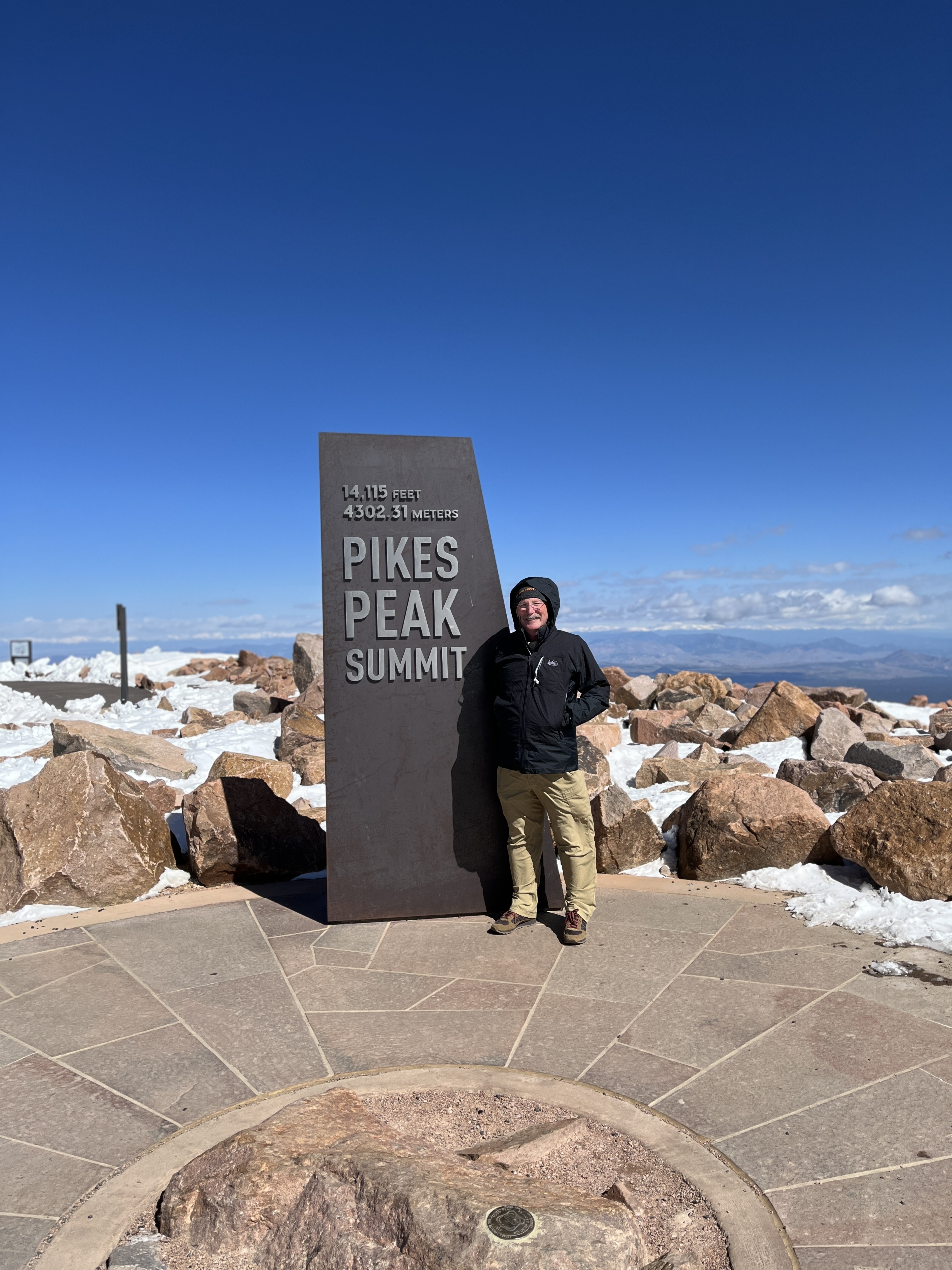 The next day I departed early and drove to the entrance point for Pikes Peak. I had previously secured an entry slot on-line. The lady at the gate said “That is a pretty hot car you’ve got there. Are you going to be able to observe our 30 mph speed limit”. “Yes ma’am” I lied. Actually it wasn’t too hard as I got higher on the mountain. The penalty for running off the road is severe! At the top it was 0 degF with the windchill. I did one lap on foot around the summit, got my picture taken, and headed back down. The trip only served to reinforce my admiration for the crazy guys that storm up there at max speed for the Hillclimb event!