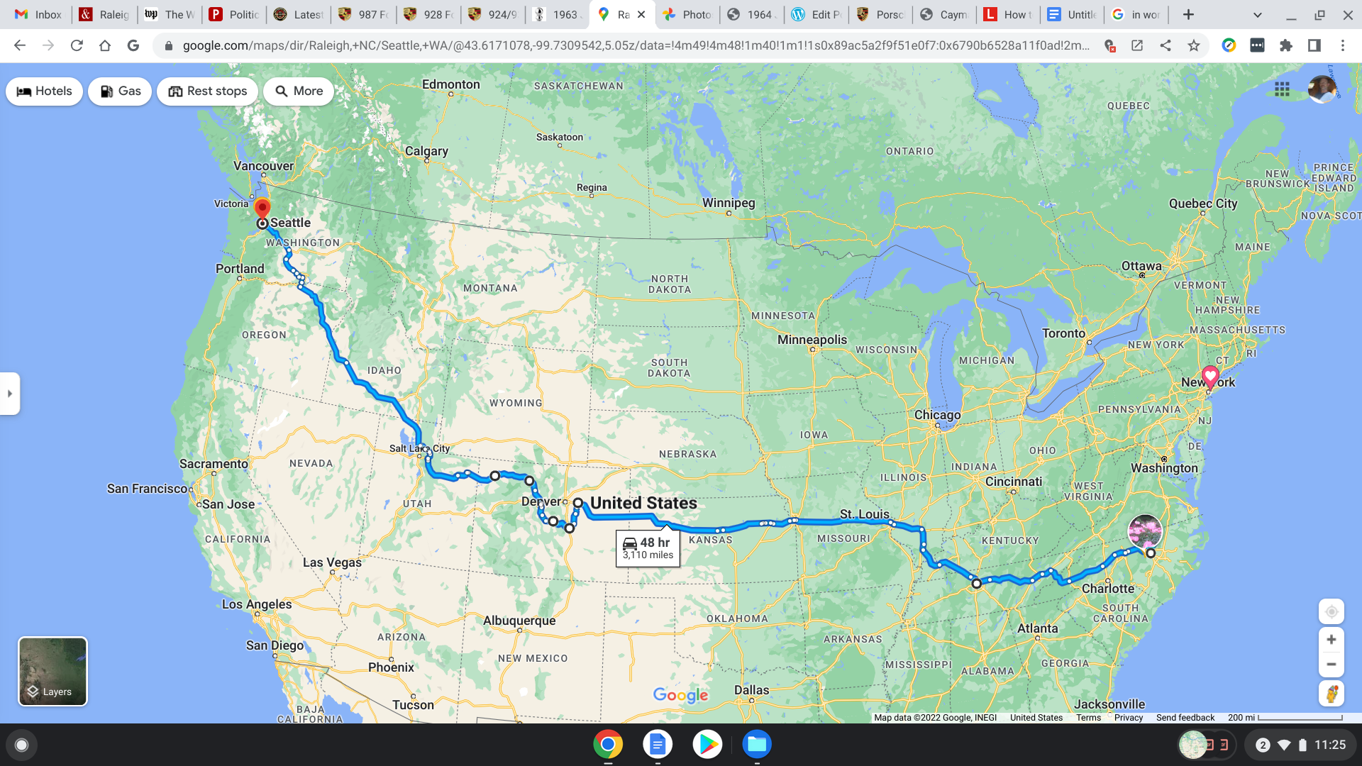 Everything was ready. One bonus for this trip was a chance to stop along the way to visit with family, friends, and car guys I have met on various forums. Although there are several routes from Raleigh to Seattle, I chose one that passes through St. Louis so as to visit a favorite aunt of mine. I had two car guys on my list, both near Denver. Another friend, in Salt Lake City, was going to be on a business trip when I passed through. But these waypoints generally established my route. Here is a map of the actual route that I took.