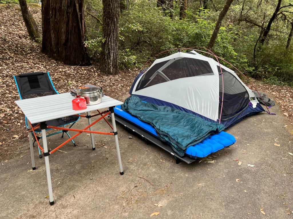 Although these were the only 2 tent camping nights on my trip, I’m going to spend a minute discussing my gear. I had developed my equipment when I went to the 24 Hours of Lemans in 2018. The goal was to take everything I needed for “car camping” in a single large rollerbag that would meet airline checked baggage limits, typically limited to 50 pounds. I purchased a lot of the light weight and compact furniture from REI. I have been a member of REI since the late 70’s. They are my go to for equipment and gear. Shown below are my 2 man Mountain Hardware tent (rain fly not installed), Helinox cot, Helinox chair, Big Agnes Q-Core airmattress (insulated), sleeping bag, table, and MSR gas stove and cookset. It may not come as a total surprise to those that know me that I sewed up both summer weight and winter weight sleeping bags from scratch a few decades ago when I started backpacking with my then teenage children. Anyway, the gear makes for comfortable car camping, with my days of lugging 50 pound packs into the wilderness being long over. All of this gear, plus a 5 gallon water jug and a small cooler, fit comfortably into the frunk of the Cayman.