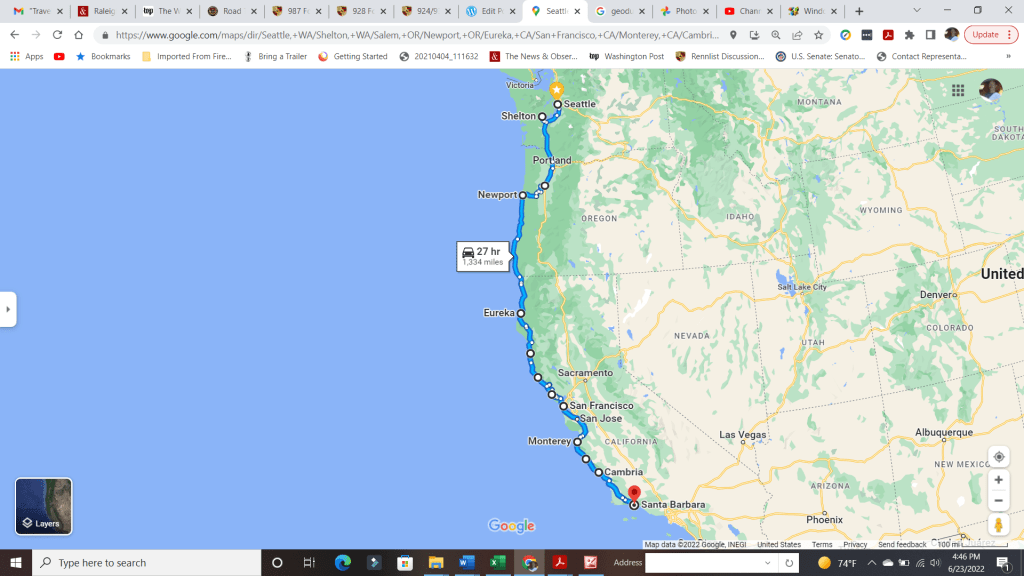 I am now entering the fun part of my road trip. Down the Pacific coast from Seattle to LA. If you missed my first 2 installments, see here and here. As discussed in my previous article, I spent about 10 days in Seattle with my son’s family and also touring Washington state with my wife to visit her family. Finally it was time to head south.