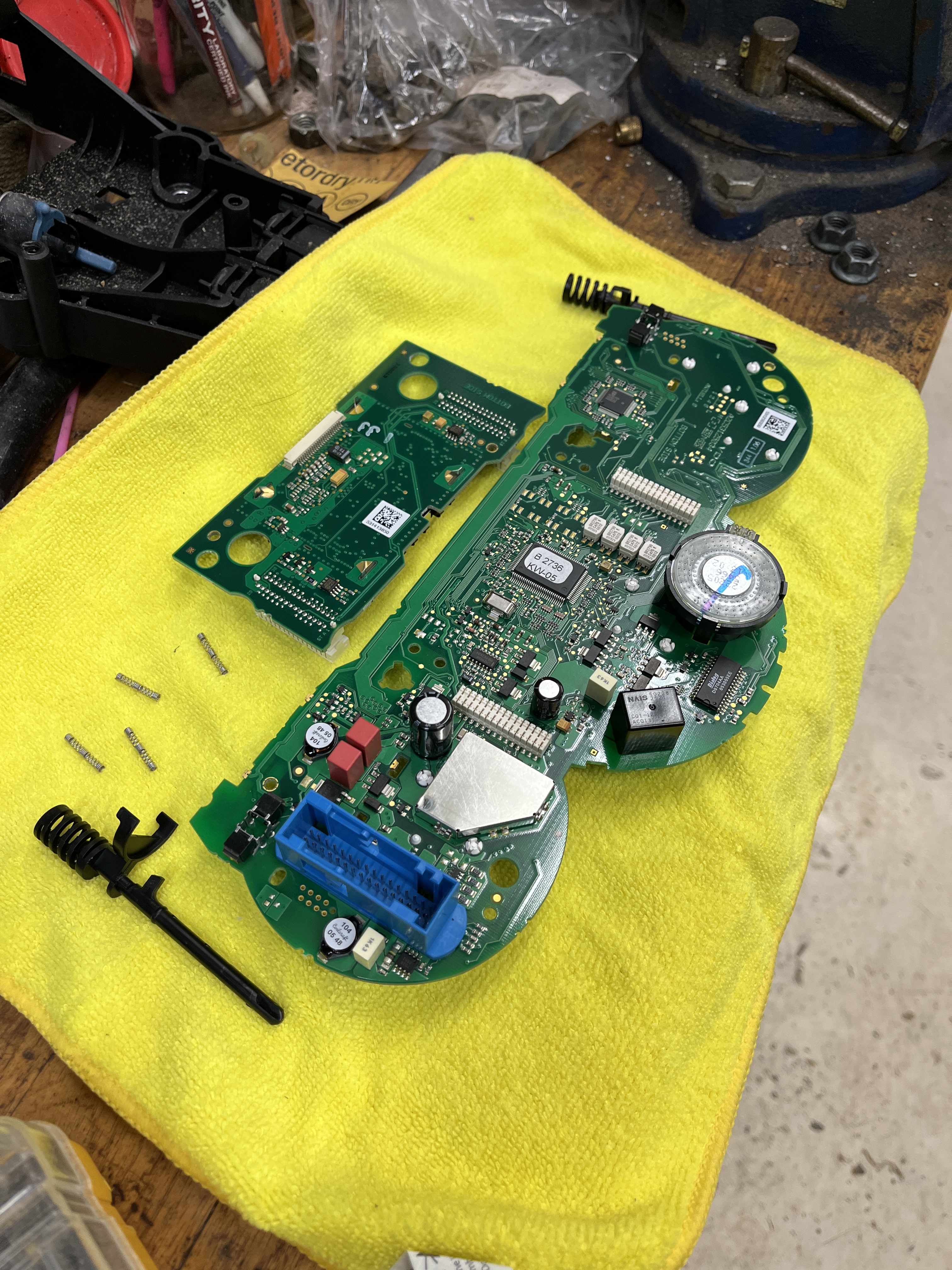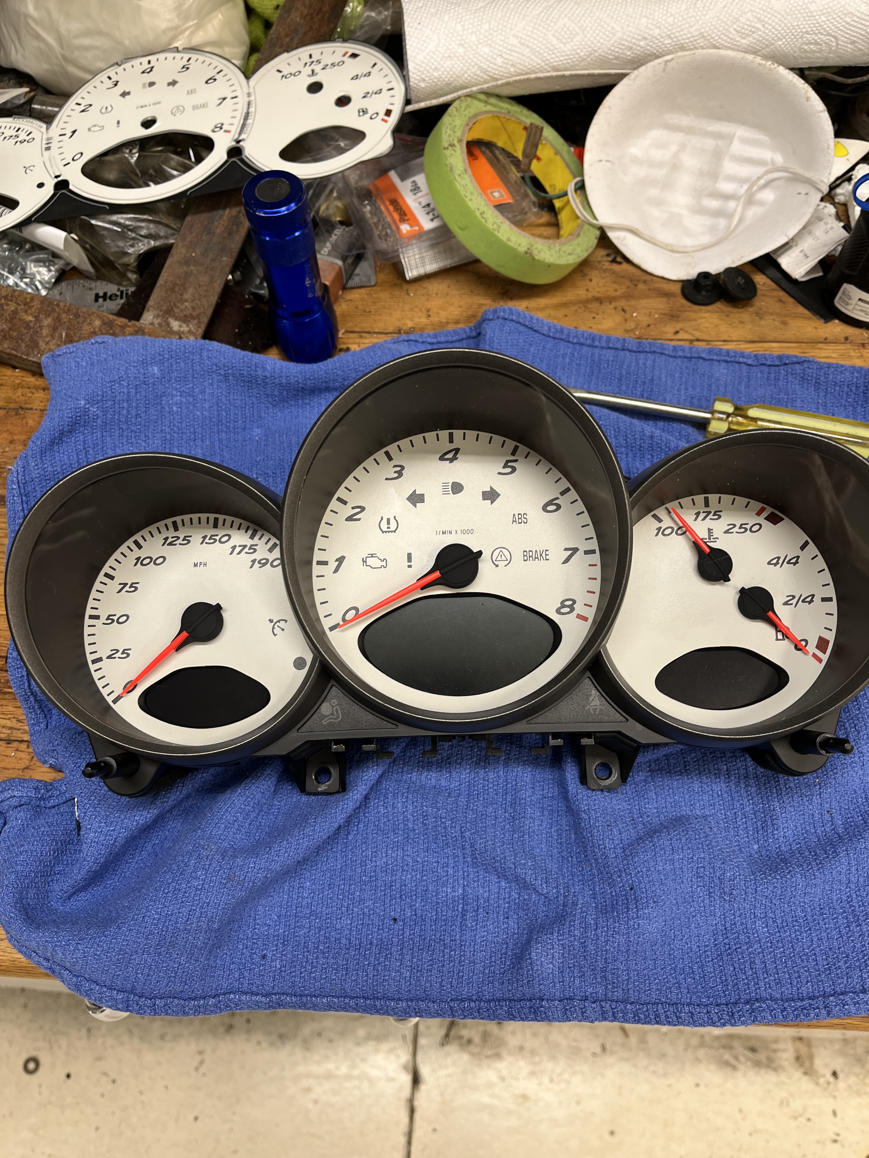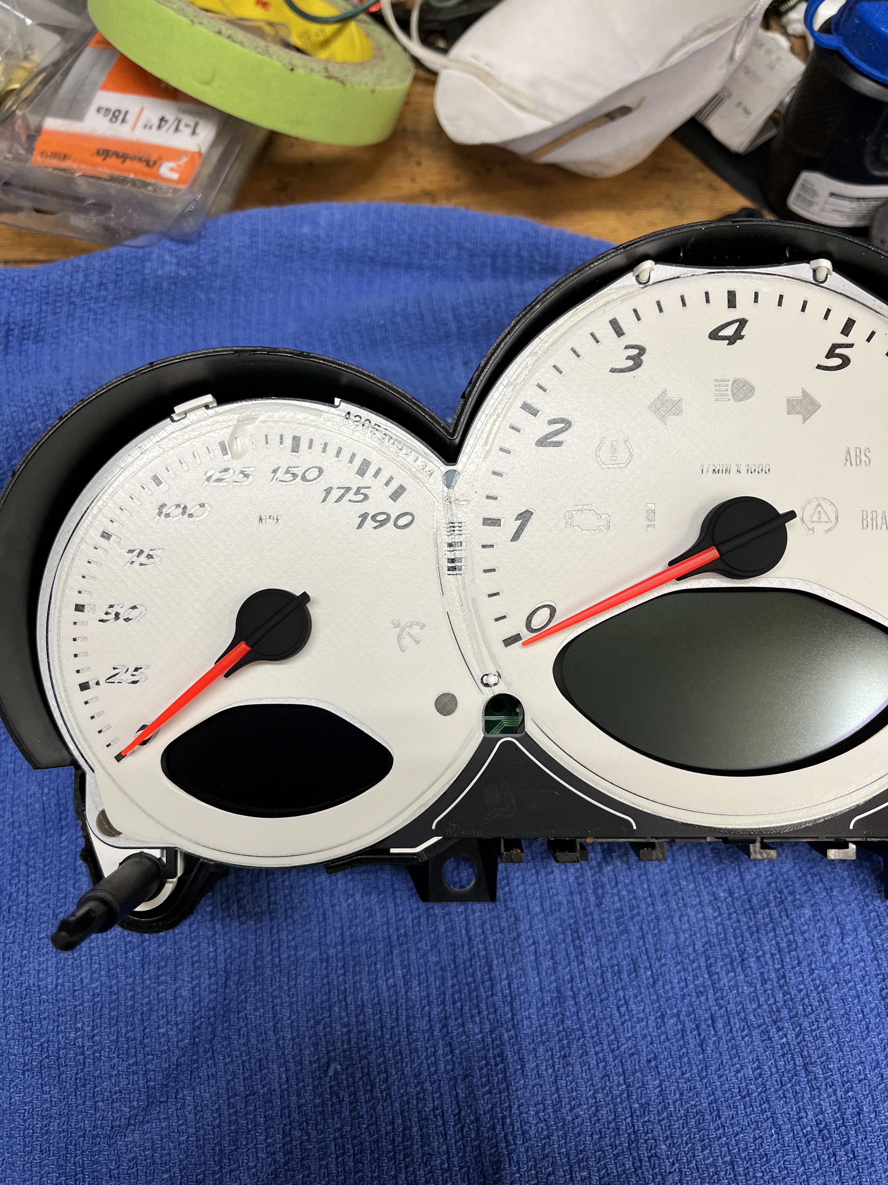 When you get it back together, provisionally go ahead and connect it to the wiring harness and turn on your key to check for basic function. I advise, if things look good, to start the car and see if the tach works. Shut it off and see if it returns to zero. Mine did not and I had to make some adjustments of the dial onto its shaft. So obviously do this before you fully reassemble the case. You might also want to go for the briefest of drives to confirm the speedometer function. My drive was to reverse out of the garage bay and re-enter, about 50 feet, which was enough! In the video they show rotating the pointers to zero. I am not sure how this works. Like I said, I had to try the tach pointer several times to get it right. If I were doing it again, I would just barely seat the needles and carry it over to the car for a quick test. If everything looked good I would fully seat the needles, then reassemble the case.
