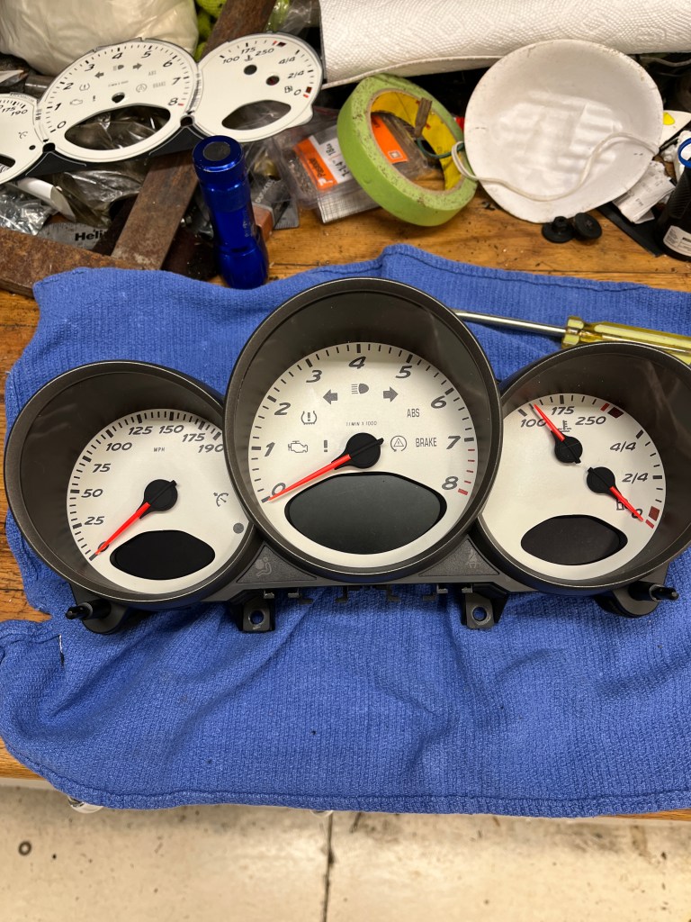 Recently I completed a task on my wife’s 06 Cayman S, which was to replace the dash gauge face overlay. As a Christmas present, I had given her an IOU to replace her horrible sticky HVAC control knobs and to replace the faded dash guage face. The replacement of the knobs is done and discussed here.