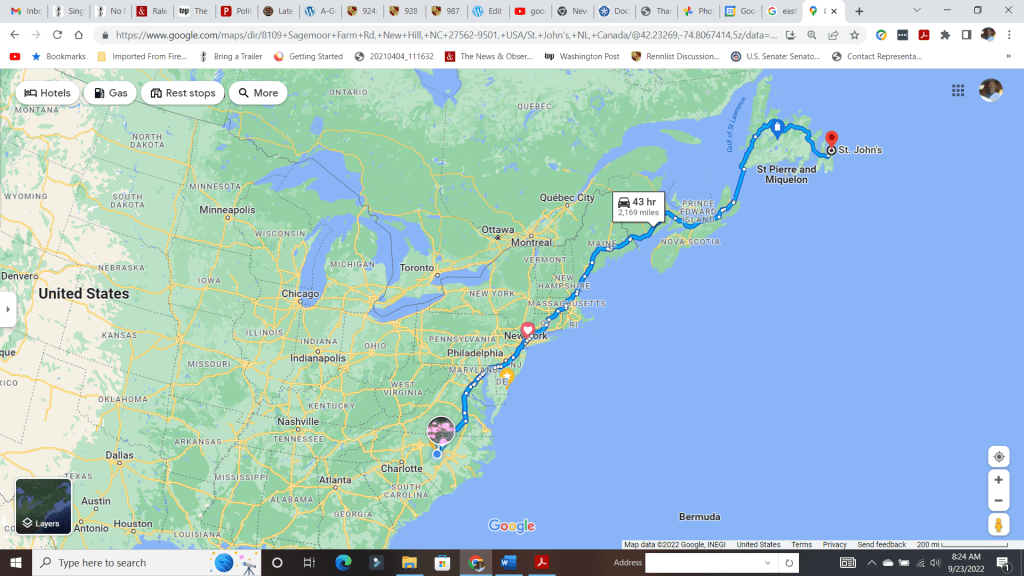 We had originally planned this trip for July. When planning for that trip, we found that yes, you can fly to NL but in the summer, all the rental cars are taken. So we adapted our planning to make a Bonzi run in our VW Atlas to NL, spend a week in leisurely touring of the island, and then a Bonzi run home. Well, I am embarassed to admit that one needs a current passport to get into Canada these days and I found out mine was expiring. You cannot get an expedited passport renewal if your urgency is “I have a vacation planned to Canada”. So I wound up getting a new passport about 5 weeks after submitting the paperwork. Not bad really, but not soon enough for a July trip. So we rescheduled to September.