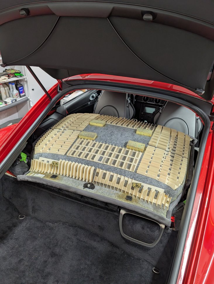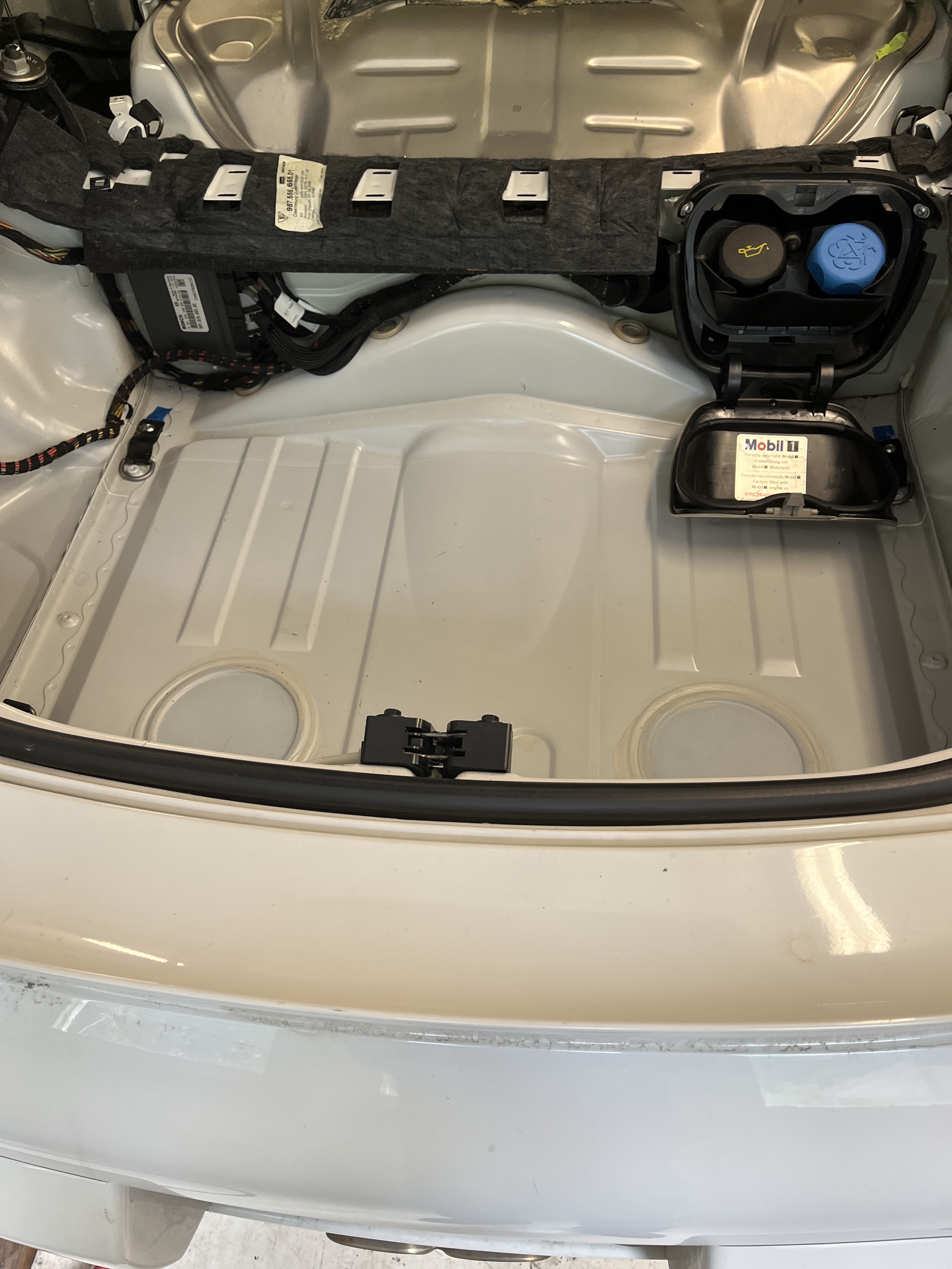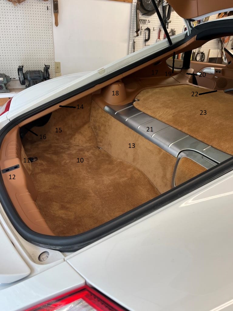- Install the plastic pieces with the storage box- several comments. These boxes are wrapped with black fiberglass matt. This mat was the favorite home of my mice. You can buy new mat from Porsche for not much money. Just forward of the boxes are some formed closed cell foam pieces. The mice also liked these. They are also available from Porsche for not much money. Anyway, because of the way the plastic pieces overlap, the one with the storage box has to go in first. I got this wrong so it is stuck in my head. It is a little bit of a PIA to lever it into position.
