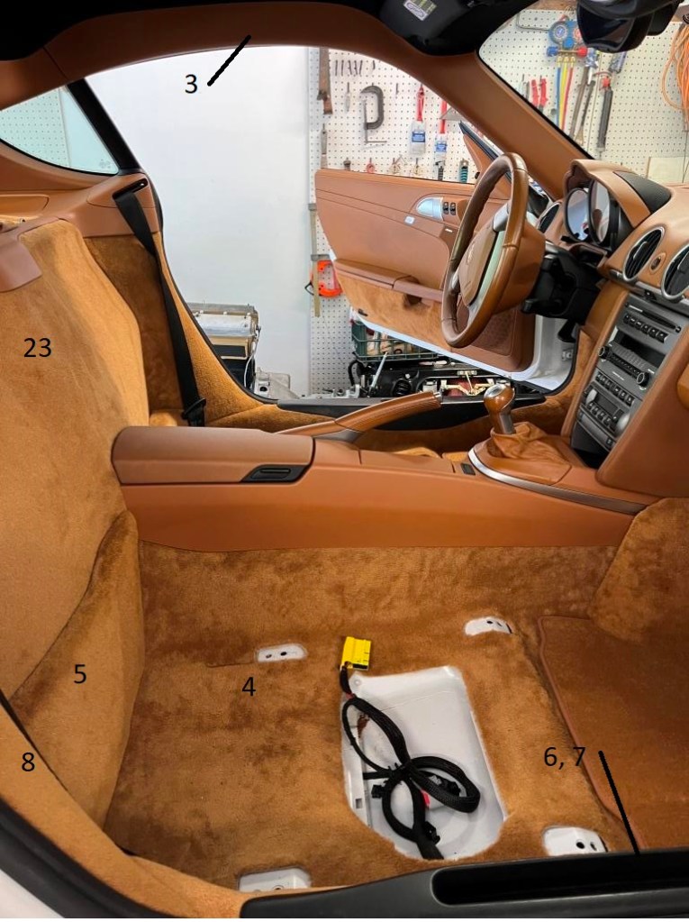I visited the parts counter of my local Porsche dealership, Leith Porsche, and we made up a shopping list. The good news is that almost all of the pieces are still available from Porsche. The bad news is they must be made to order, which means I had to pay in advance, non-refundable, and it took months to obtain the parts. BTW if you show up at Porsche parts with your VIN number, they can tell you what your factory color is for your carpet. That may be obvious but in our case, our version of “tan” could easily be confused with other shades. The most significant carpet piece is the one piece molded item that sits in the floor under the seats. I purchased most of the available pieces with the exceptions of a few, like the one at the oil/water filler flap, that cost a rediculous amount. It was about $3000 for the pieces I bought. Note- after installation, I found the carpets sent to me by Porsche to be a dead nuts color and configuration match to my original pieces.