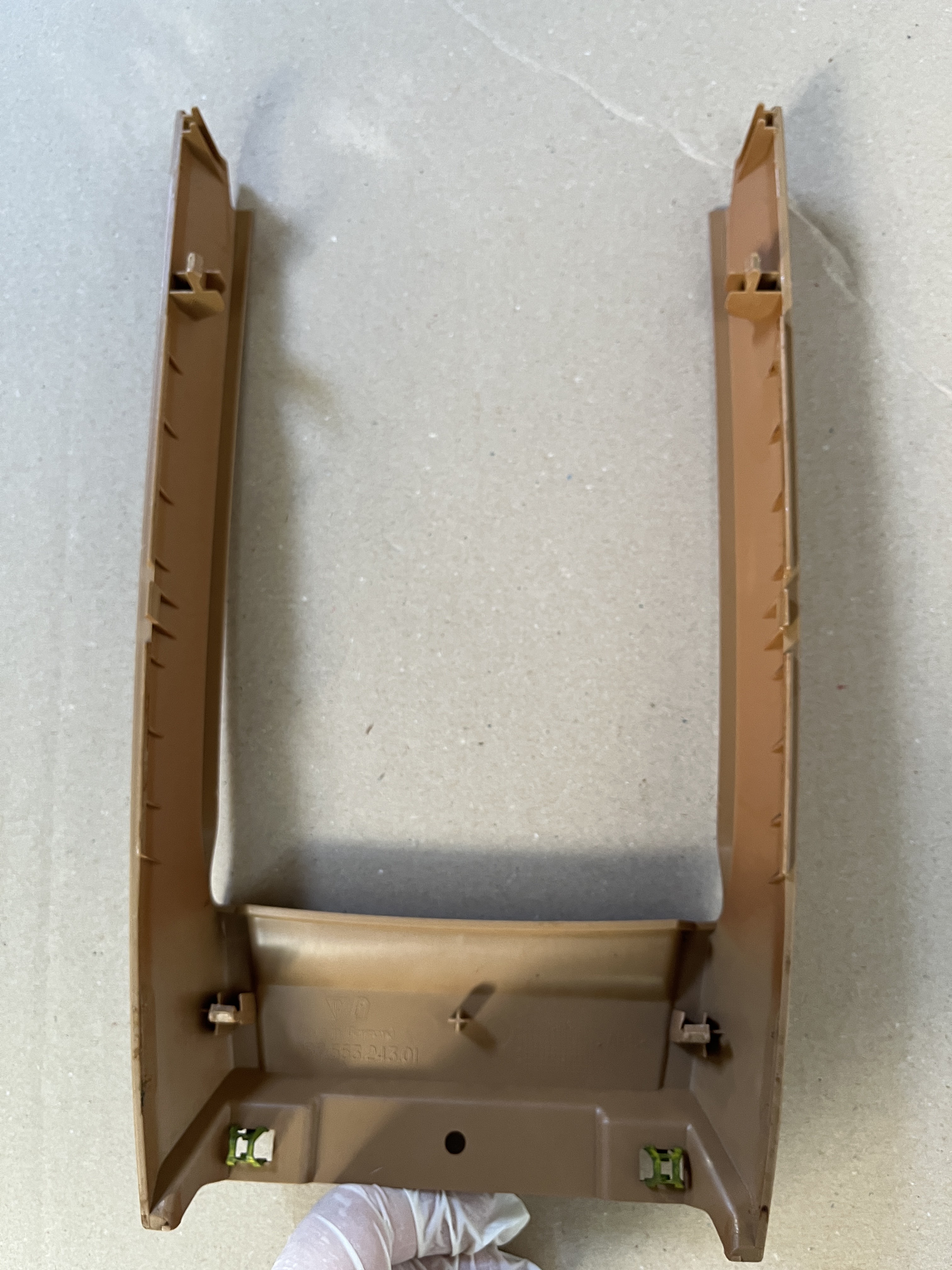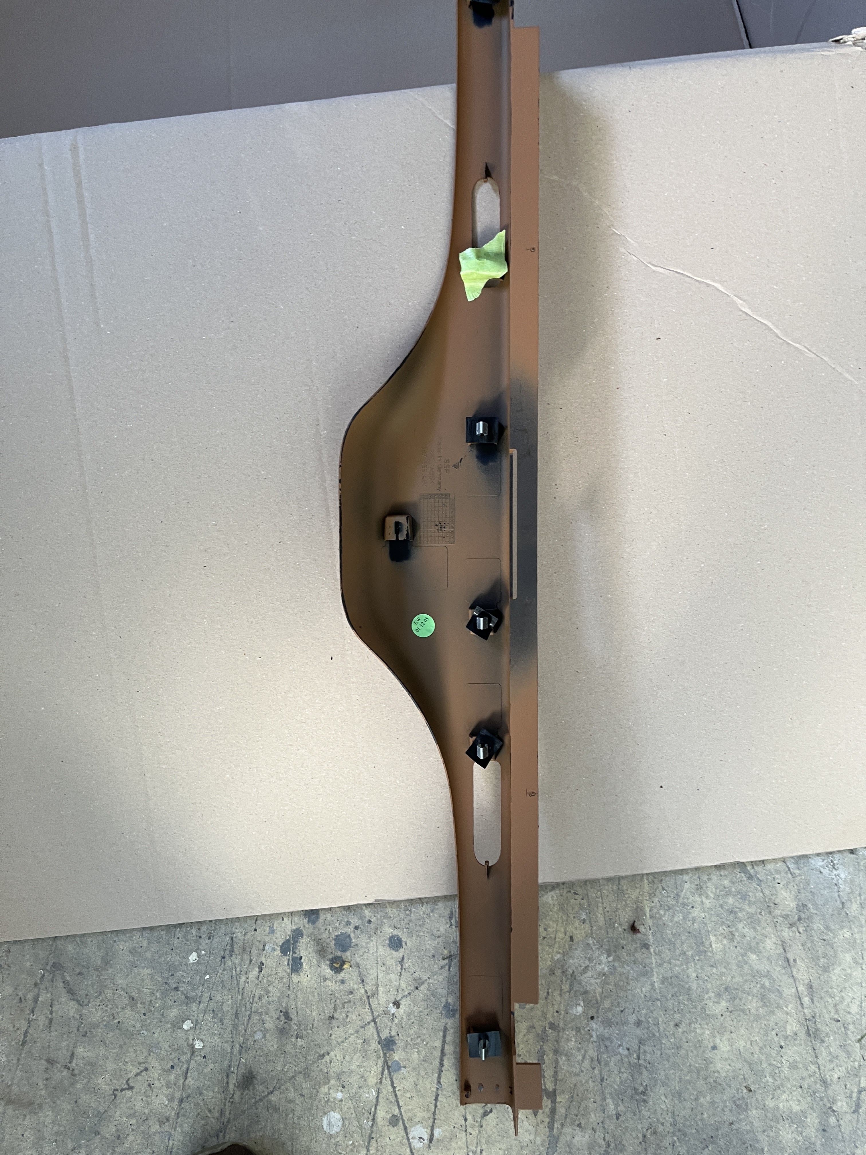 As you can see in the above pictures, the plastic panels had a lot of spots where the color had chipped away and the black base material was exposed. I sent a representative piece to Color Plus Leather Restoration, where they mixed up an exact match paint. Their paint is meant for leather and vinyl but here is how I used it on the plastic pieces.