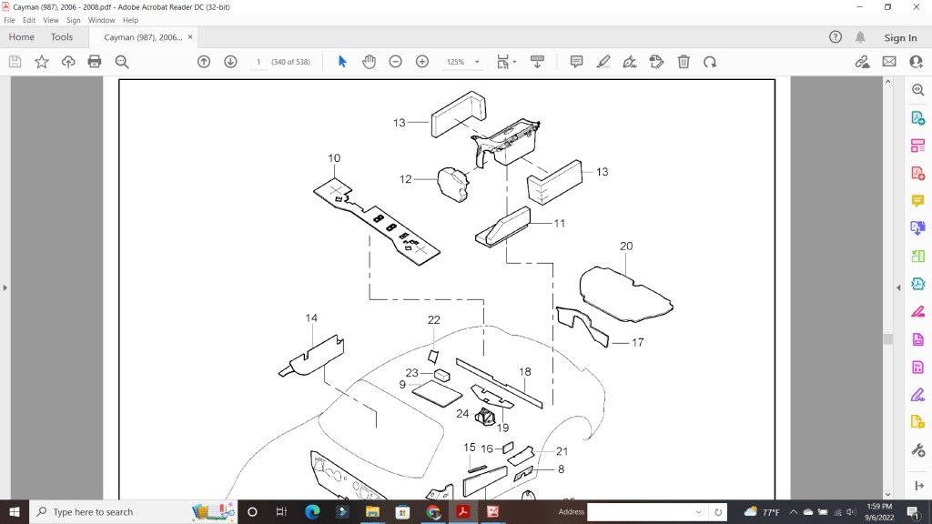 I am documenting my recent efforts to remove and refresh the interior on my wife’s 2006 Cayman S. Unfortunately the reason I am refreshing the interior is due to a serious mice infestation. We had been finding mouse turds on the carpet and a gradually increasing bad odor. At some point I found a hole chewed in the cabin air filter, which I assume was their entry point to the interior of the car. I have added window screen wire over the filter and also over the drain tubes that exist in the vicinity of the cabin air filter. I hope this will shut the little buggers down, because they have caused me a ton of money and time. Anyway, if there is a silver lining to the cloud, it is that I am installing all new carpet and am painting many of the hard plastic parts in the interior. So here I will document some key DIY info such as how to obtain replacement carpet and how to remove/refresh much of the interior carpet and plastic hard parts.