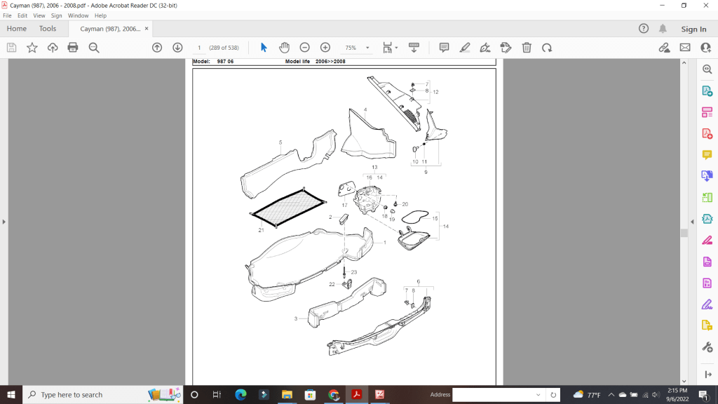 For various reasons, I have previously had the A pillars cover off (18). It is not the first piece from an “overlap” standpoint but once you get everything loosened up from a clip standpoint, you pull it upward/rearward at the base of the windscreen to release of “post in the hole” there, then it can be brought forward to clear its aft end. So you can get it out by itself, without disrupting things. The piece around the fixed window (21) has one screw at it’s bottom forward corner and two clips. Once it is out, you can disconnect the courtesy light. There are two little pieces (29) that pop out first. I can’t exactly recall but there is some reason for these pieces to be separate. Don’t lose them!
