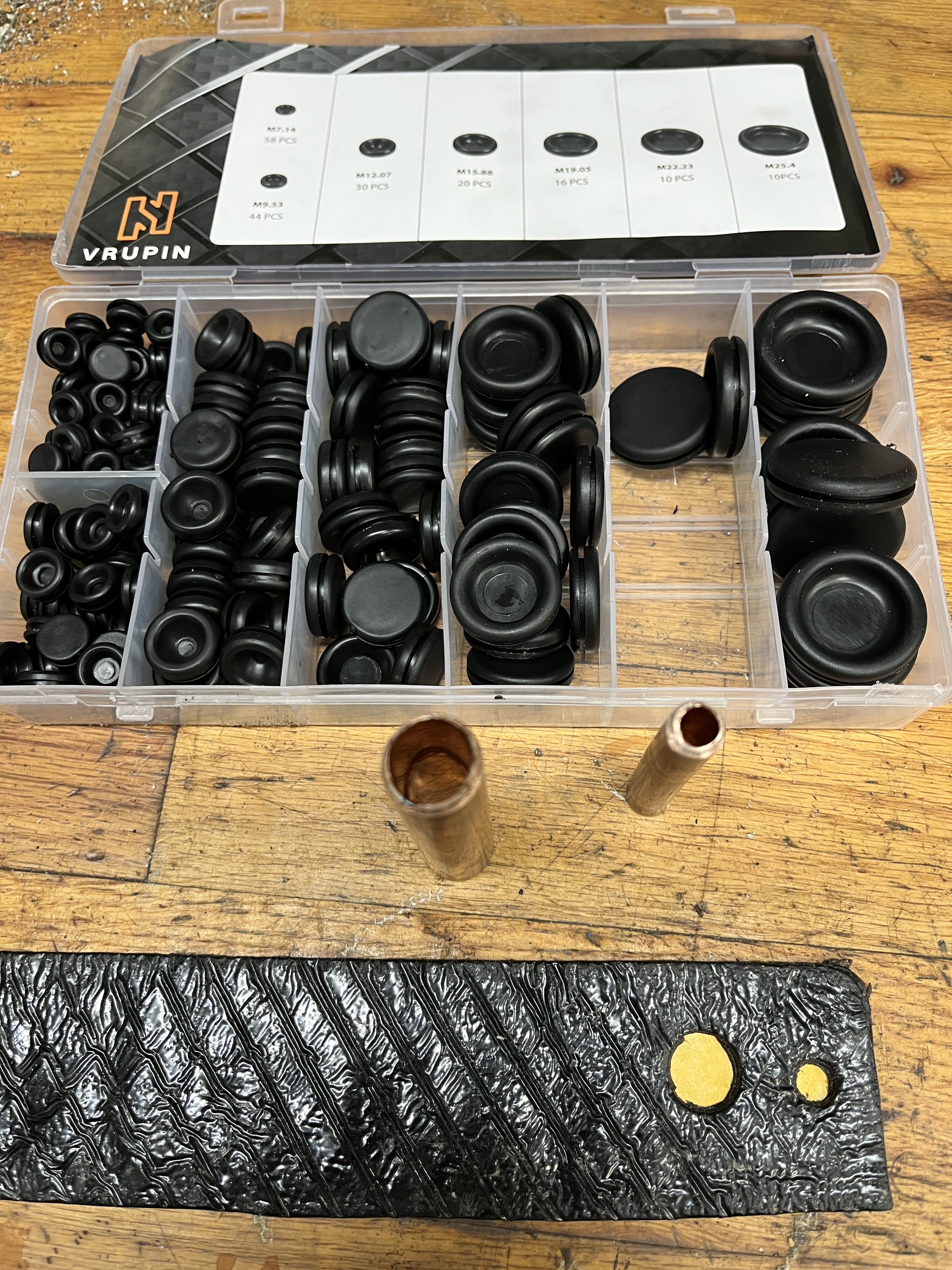 I used a modern equivalent, 3M Sound Deadening Pad P/N 08840. It is about 1/16″ thick, has a sticky backing, and has a diamond pattern. I test fit the pieces, cutting them to the desired shape. Especially those pieces in the rear floor pan area required cutouts to expose critical fasteners such as for the seat rails. I used a 1/2″ copper water pipe with one end ground to a taper to neatly punch out the holes. I purchased a generic sold rubber grommet kit off of Amazon and installed the grommets in the drain holes prior to installing the pads. The material is easy to work with and if heat is applied with a heat gun, can be formed to mimic the various depressions in the sheet metal.