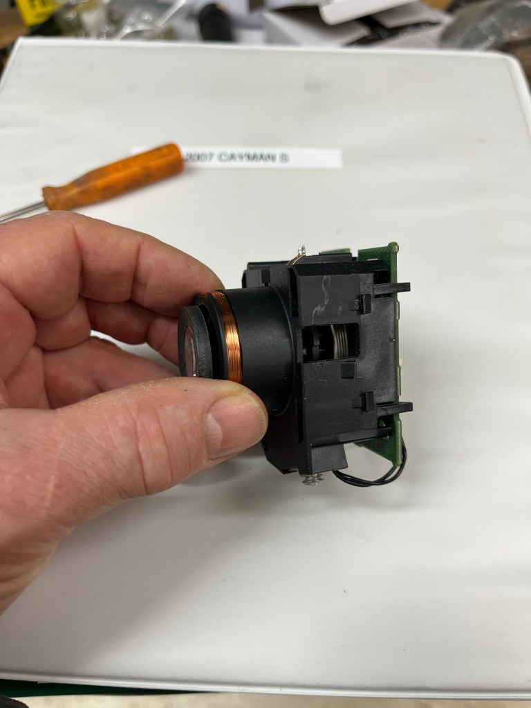 I went ahead and opened up the defective unit. The following pictures tell the story. Obvious features include a complex circuit board, a tightly wound coil of copper wire wound around the lock cylinder, and a set of wipers that work to transfer into from the rotating assembly to the stationary one. I could see where these wipers might become a wear issue, just like on the “flappy gate” air flow meter on a 944.