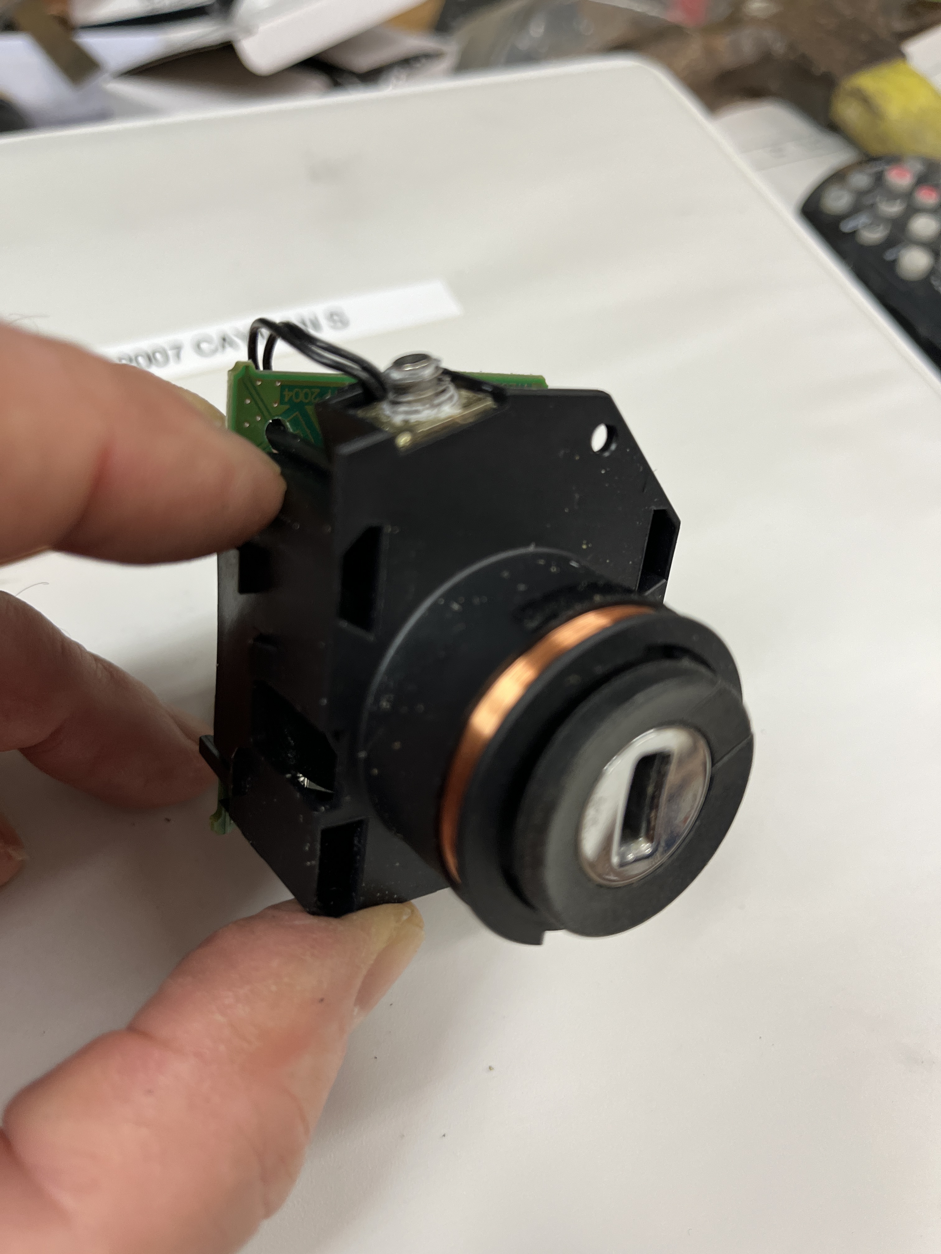 Installing the new cylinder was not too bad. The bezel around the key prys out pretty easily. There is a threaded ring around the cylinder that I got to unthread simply by using a small screwdriver. Then the cylinder falls into the space under the dash. This space is actuallly very hard to get to. There is a small space just big enough for my hand, going up and over the bracket for the OBD port and the curtesy light. There was not enough slack in the cable to get the cylinder out. But there was a tiedown on the wiring harness that I broke loose by inserting a long thin chisel into the dash opening and slicing it off where it attached to the underside of the dash. Then there was enough slack to get the cylinder out. Actually it’s a rectangular box.