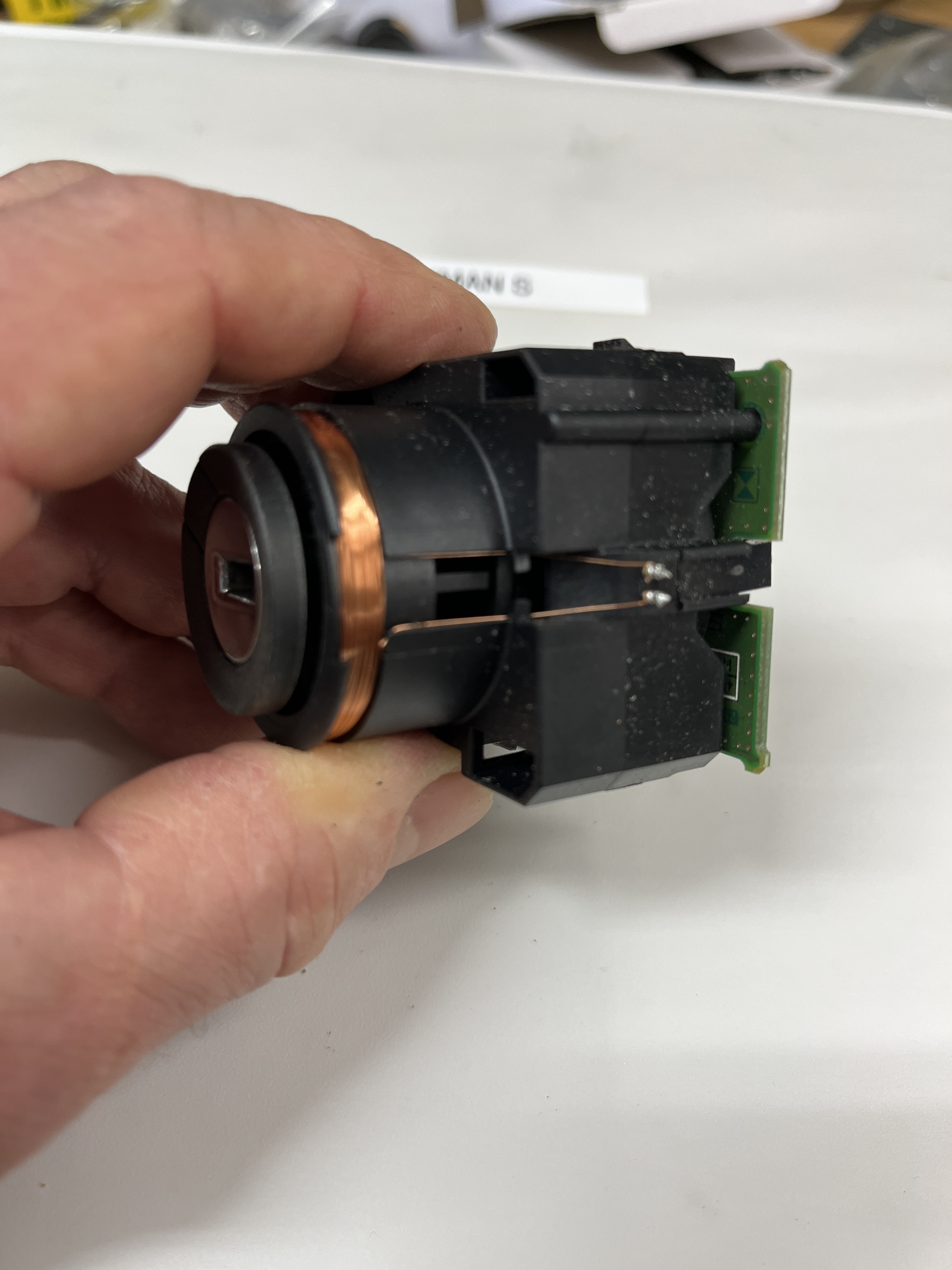 I went ahead and opened up the defective unit. The following pictures tell the story. Obvious features include a complex circuit board, a tightly wound coil of copper wire wound around the lock cylinder, and a set of wipers that work to transfer into from the rotating assembly to the stationary one. I could see where these wipers might become a wear issue, just like on the “flappy gate” air flow meter on a 944.