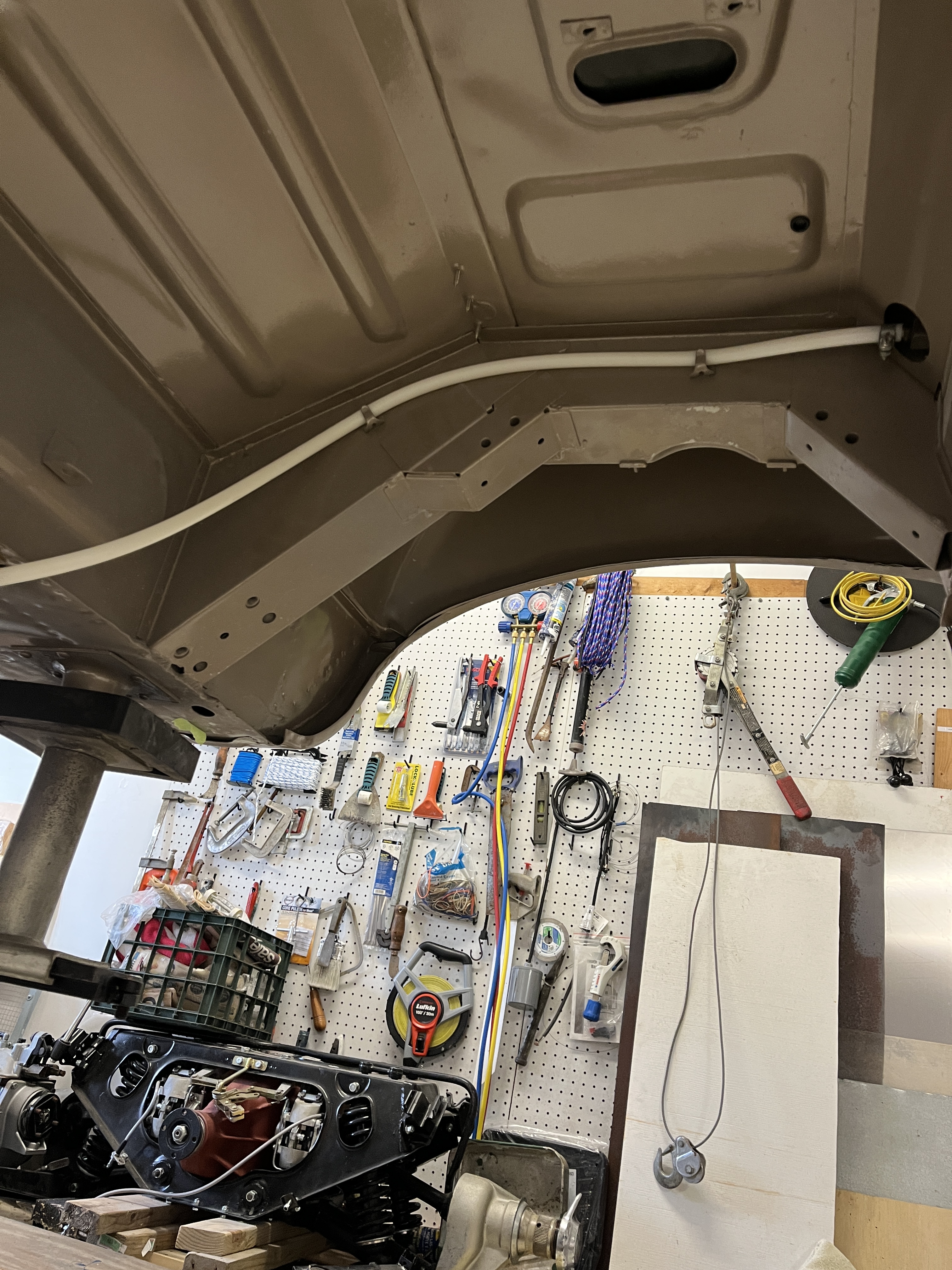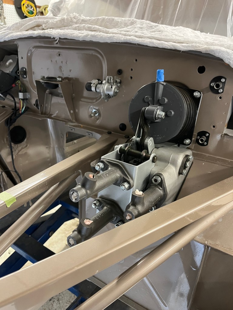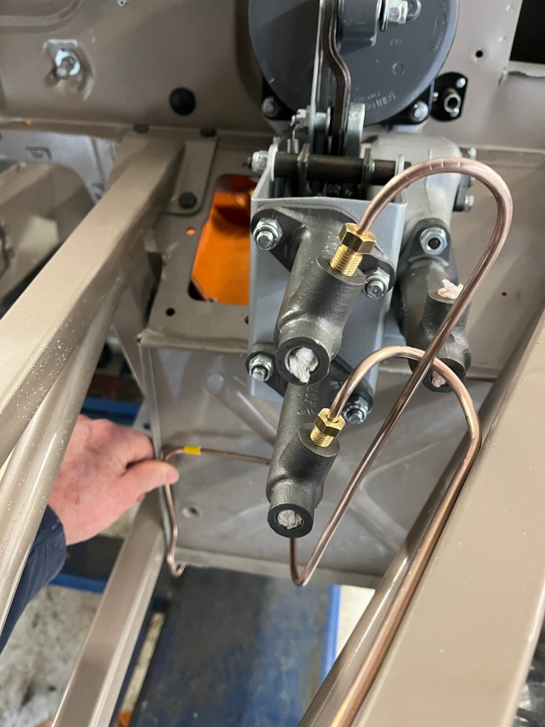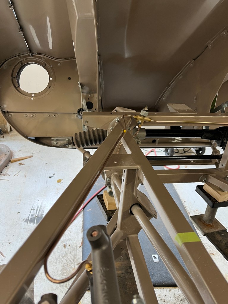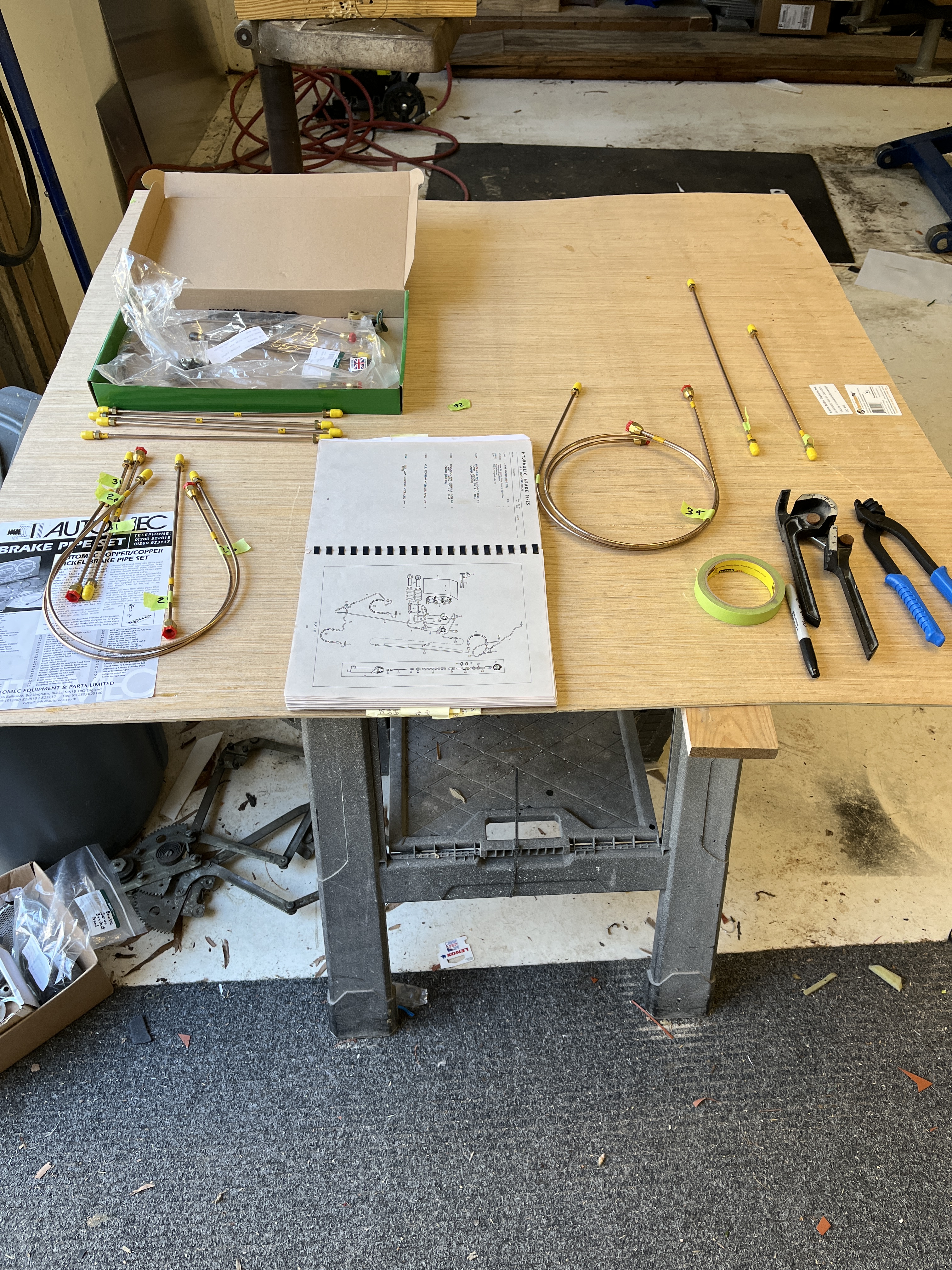 First up was brake lines. At some point last year, I had ordered and received pre-bent lines from Classic Tube. They looked very nice but when I got into actual fitment, they just were not going from point A to point B correctly. I decided to return them and go an alternate route. I purchased a set of Automec lines from SNG. These are not pre-bent but they are cut to length, with the correct flares and fittings installed. They are made out of a copper-nickel alloy that meets modern standards and requirements. They are quite easy to bend. I studied a variety of my go-to reference cars to establish the general routing. First I installed my master cylinder and pedal assembly (previously discussed in the article here). This established one set of endpoints. In general, the other endpoints were the brackets at the two front wheels and at the rear of the car, where the flexible rubber hoses attach. Also, there are two lines on the IRS to be bent (the crossover lines on the calipers were previously installed). I’m not going to say it was easy but I found it to be rather straightfoward to bend the required lines. I established a rough configuration using electrical wire. I then practiced with some 3/16″ steel tube that I purchased from NAPA. Finally I bent the actual copper-nickel lines. I also did the clutch lines but seem to have forgotten to take pictures of those. One drawback to this approach is that I believe the original lines were galvanized steel and thus silver in color. My lines have been sent to my zinc plater. When they come back, it should be a quick job (uh-oh, I just jinxed myself!) to install them.