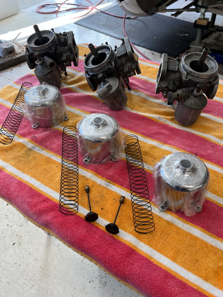 Yet another task was to evaluate my 3 SU carburators. There was no doubt, they needed to be nicely restored. In this case, I decided to defer to the expert, that being Joe Curto in NYC. I talked to him and knew that was the way to go. On the cast aluminum bodies, he does a 3 step process. They are first cleaned in an ultrsonic cleaner. Next they are bead blasted. This leaves an appearance that is clean but too “frosty” for lack of better word. Finally, Joe has a media tumbler that achieves a fresh cast look. He of course replaces all the gaskets and makes sure the throttle shafts are sealing correctly. So I boxed the 3 carbs up and sent them to him. In the process, I found out that I was missing some linkage pieces. They are available from SNG and aren’t cheap. Sigh! BTW, my “domes” had been previously polished so at least that part is done.