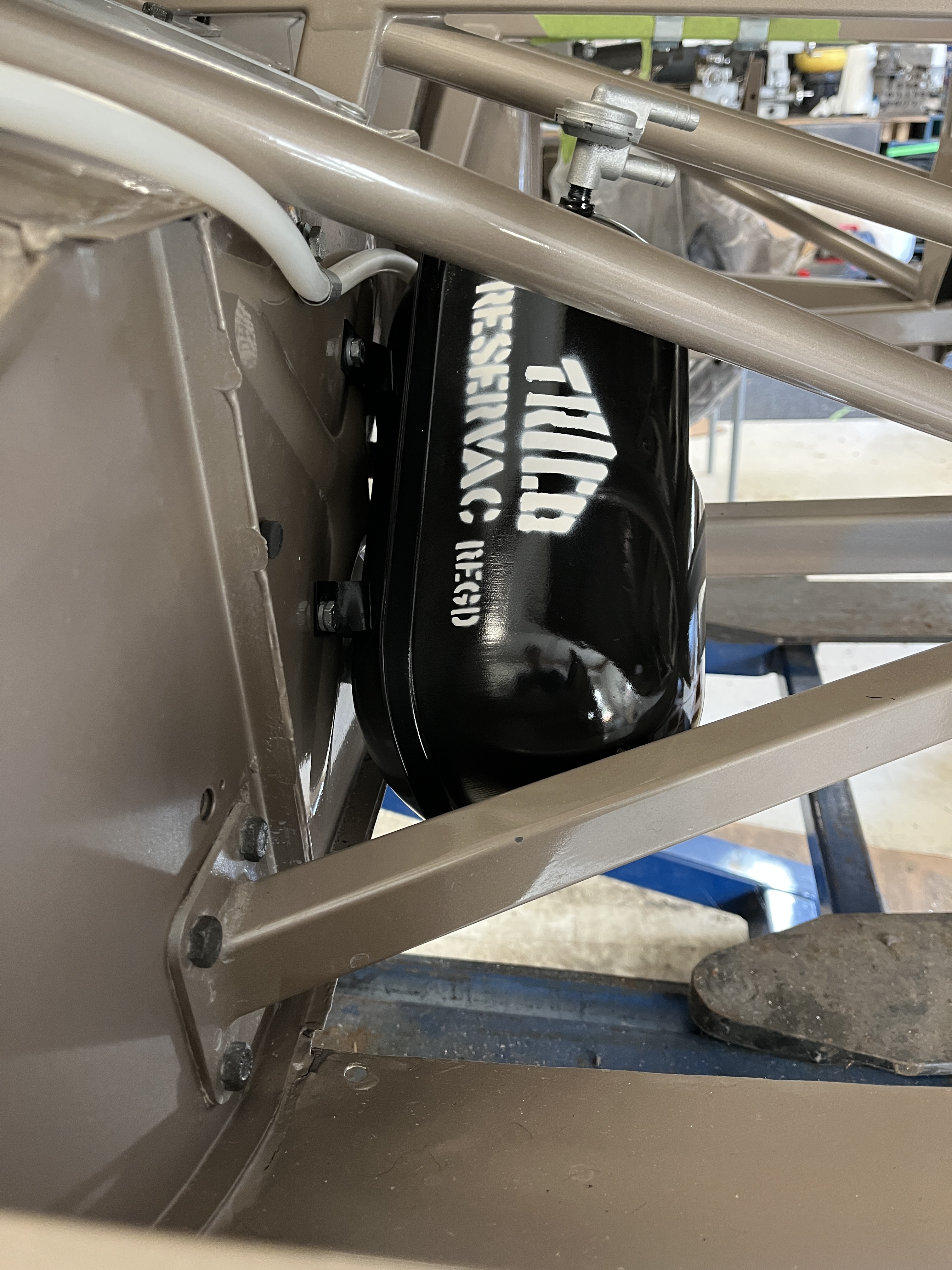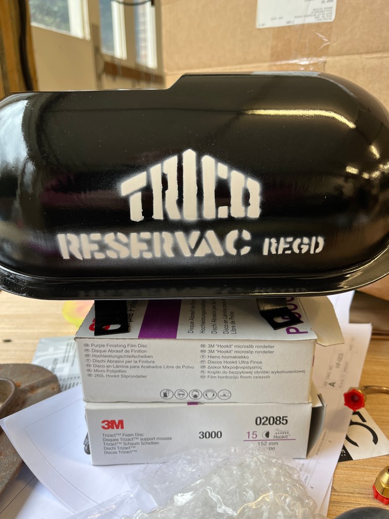 Moving on, I wanted to tackle the brake booster reservoir. This reservoir is supplied with engine vacuum. If your engine suddenly dies, the reservoir gives you one or two stabs of power braking. Mine was shabby but per usual, a session in the bead blast cabinet and some rattle can black enamal paint returned it to it former glory. Haddock and Mueller report original cars with and without the Trico logo. Since I think that is kind of a cool artifact, I decided to do mine with the logo. An accurate to scale pdf of the stencil is available at the UK Etype forum. Reports are that the finished logo should look like it was done by an apprentice in a hurry. I was able to acheive that look without trying!