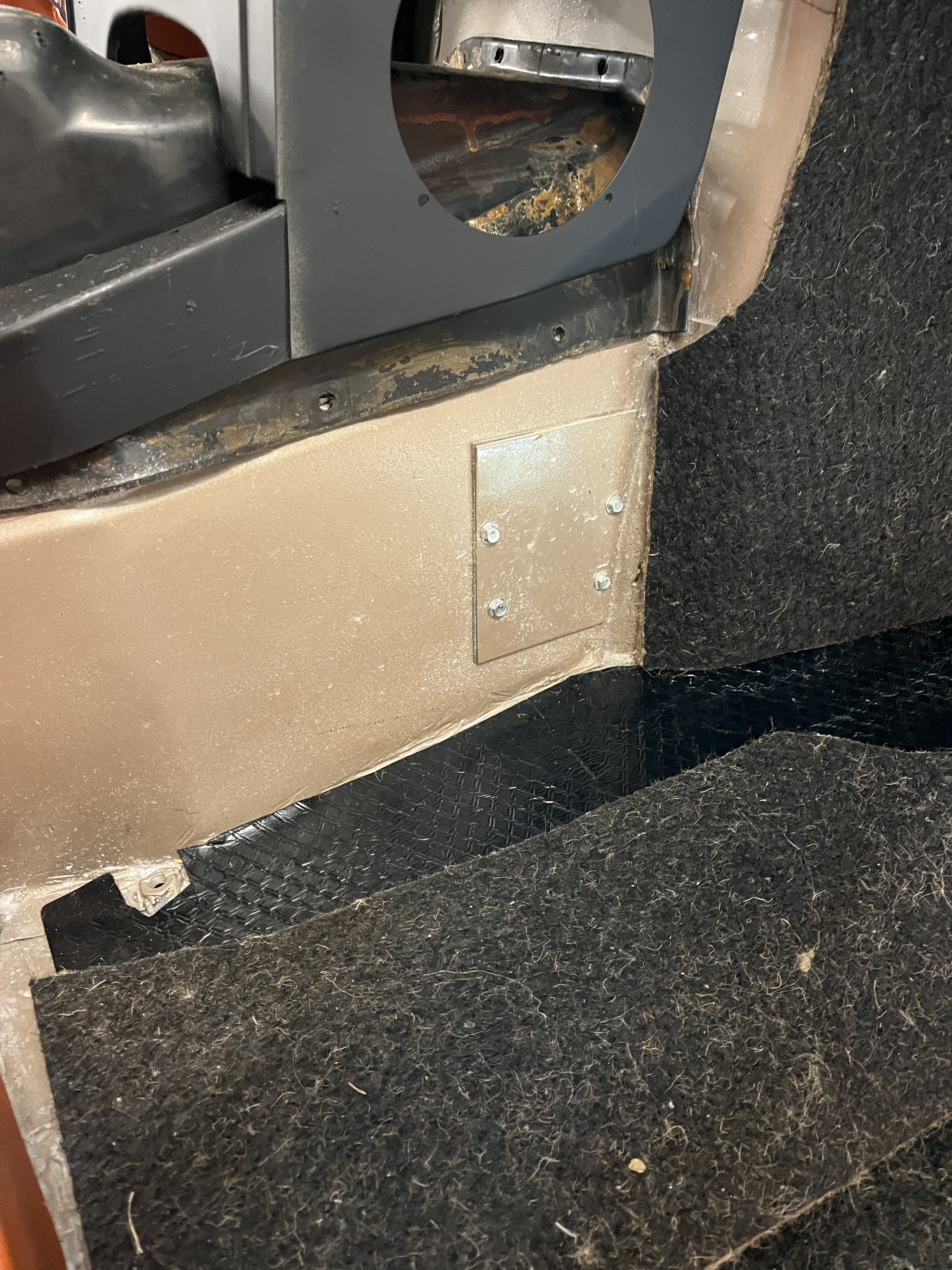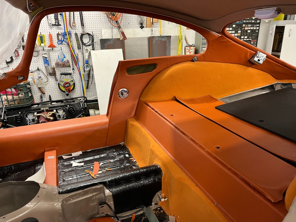 At some point in this process, some of the trim pieces for boot luggage extension board came in. It is still not done, as some other pieces are with the chrome platers but it is looking more tidy now. You might note that the hardura mats in the boot are curled up. The mats are attached with snaps but the ones I got with the kit are the wrong size. New ones are being made but until then the others are there just to fill in the space.