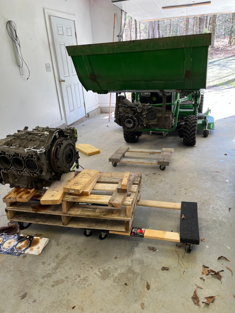 -You really really need a lift. I guess when I was twenty something I would have done this with a jack and concrete blocks but thankfully those days are past. By default, the engine needs to come out from the bottom. So you need to be able to raise the car enough to trolley the engine out once it is lowered. In my case, I used my single post lift, which worked just fine. A 2 post lift would also work well. A “low rise” lift would probably work OK. A drive on lift is going to be problematic. Besides the clearance issues, Porsche does not want the full weight of the vehicle on the rear suspension/rear tires once the various cross braces are removed, so your drive on lift would need some sort of supplemental lift bars. I settled the engine/transaxle on two furniture dolleys, with two thicknesses of pallets on them. This gave me ample room to crawl under there and remove the final 10 bolts holding the engine to the car. Then raise the car and roll the engine out.