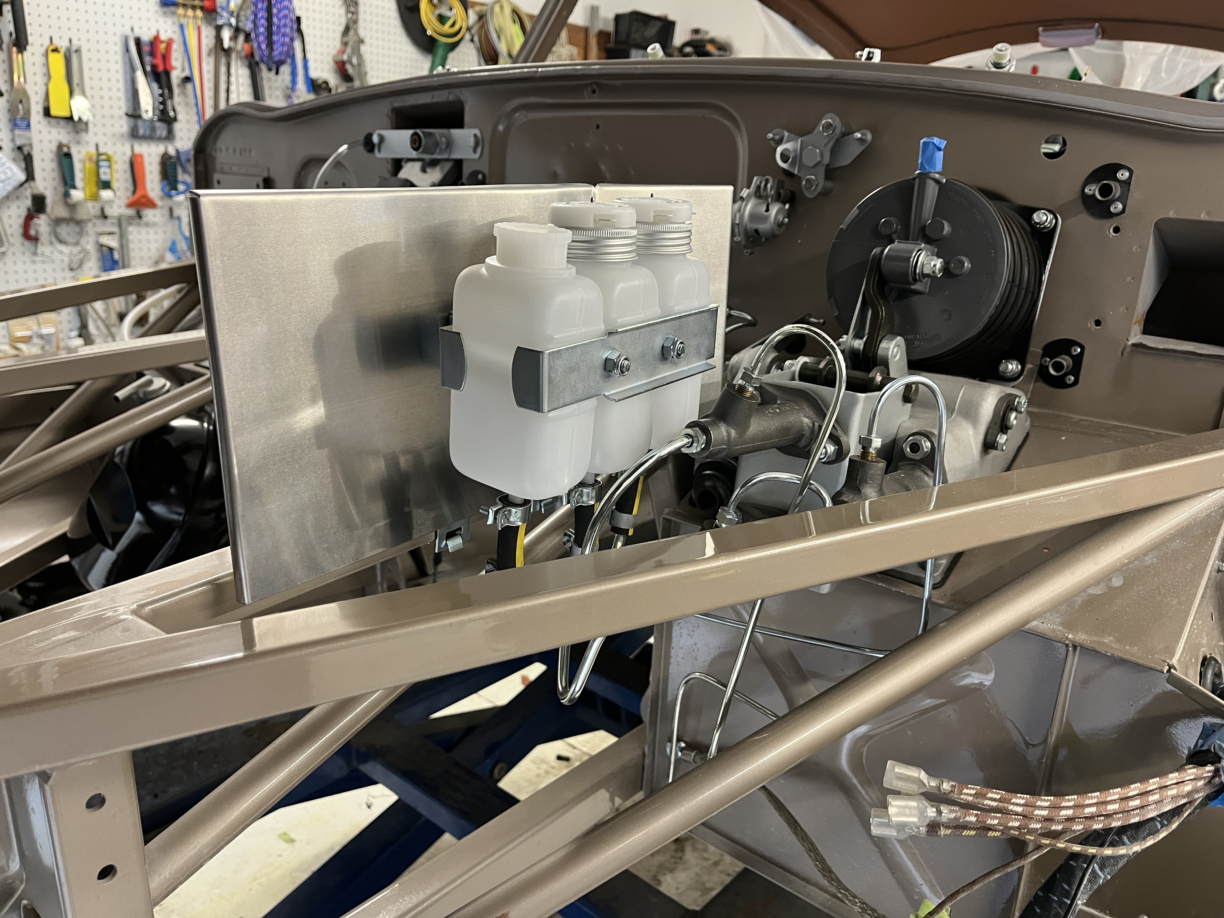 In my last article I discussed bending brake and clutch lines, using an Automec kit from SNG. I completed the bending and sent the lines off to be zinc plated, as I did not feel that copper offered an authentic look. That worked out well. The lines are installed. I jury rigged a connection to the IRS so that I could fill, bleed, and test the rear circuit for leaks before committing to a full installation of the IRS. I was pleased to find just one small leak, that was resolved with a tightening of the fitting. I’ll post some pictures at the end of the article.