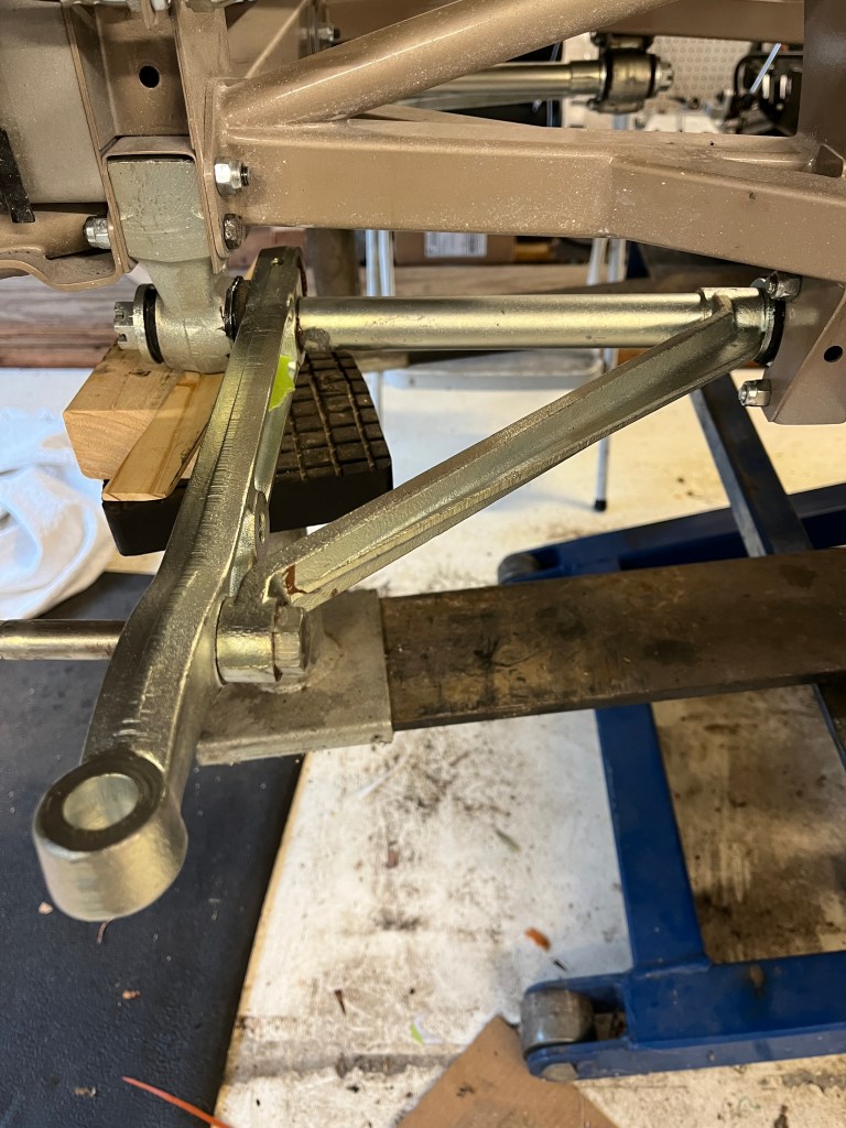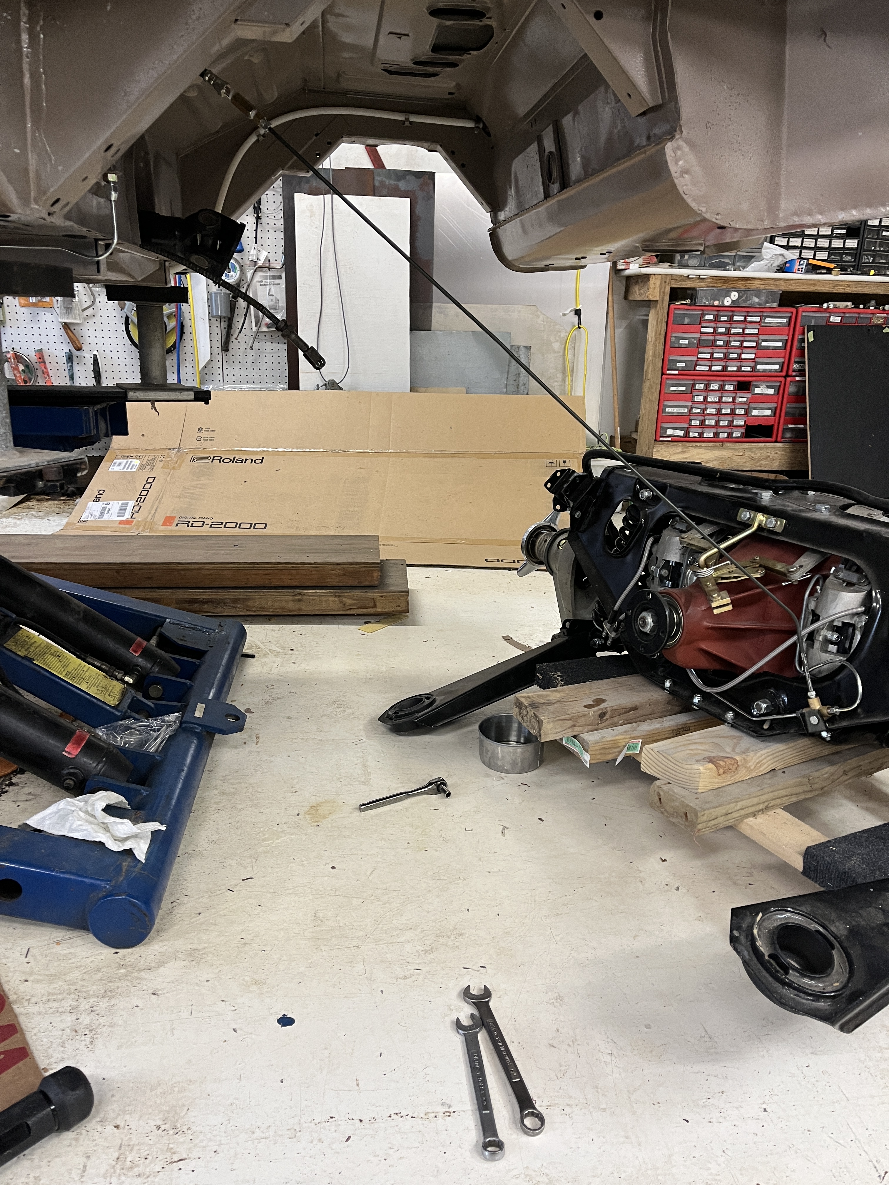One thing that went pretty well was the installation of the lower front suspension A-arms. I wanted to get these in place mainly so I had additional jacking points. The car is currently mounted on my low rise lift. It has four extendable arms, similiar to a two post lift. I have found from past experience that they are limited in their reach. I did a “test” installation of a spare engine and transmission last year, mainly to get some weight into the car before finalizing the bonnet to cowl gaps. Basically, there can’t be any portion of the lift that reaches across the car forward of the rear of the opening for the transmission. This is going to be tricky with my lift, as I prepare to install the assembled engine/transmission from the bottom of the car. Shortly I will temporily suspend the body shell on jacks and move the lift rearward as required to clear the transmission. Then I will raise the body up, trolley the engine into position, lower the body back down, and make the attachments. Exciting times. Stay tuned!
