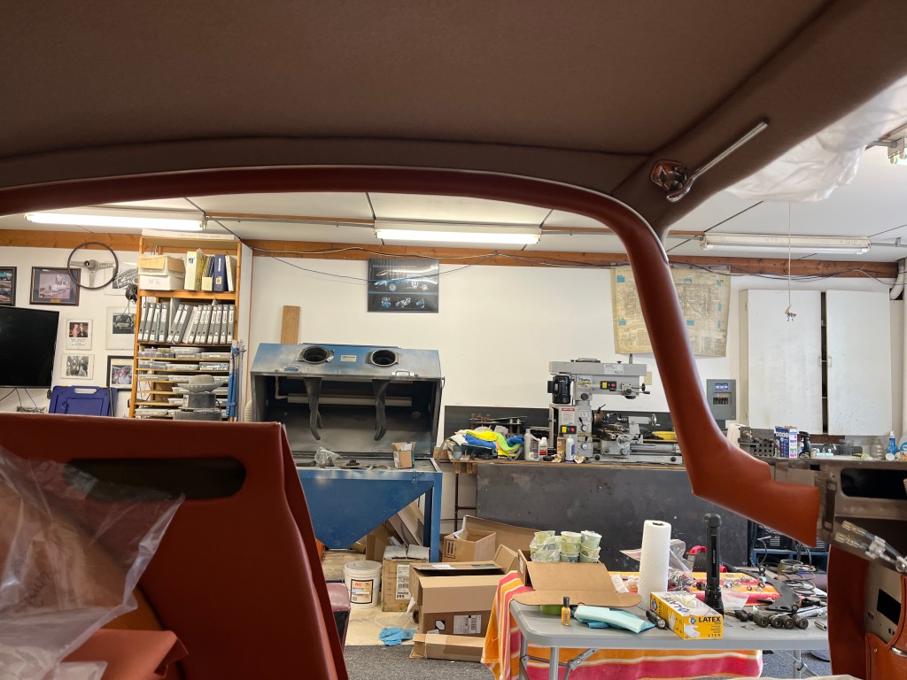 Another thing that happened was that I received additional materials from my upholstery supplier. I was not happy with my first attempt at the cantrails (the hockey stick pieces over the doors). There were too many wrinkles. GB Classic Trim supplied me some photos of how they do it. I applied their process and got much better results.