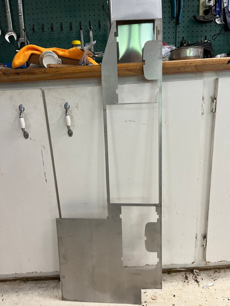 Next I turned my attention to the radio/ash tray panel. This one was more challenging, as it had a rounded opening in it with a 90 degree edge. I used the original to trace out the shape onto a piece of popular wood, which I cut out with a combination of a hole saw and a router. As usual, the opening in my original piece was not a symetric shape. A bandsaw would have been better/easier but the router can be used to “freehand” curved lines. I made two pieces and clamped the aluminum between them. Then I carefully hammer formed the rounded opening. In this case you are making a 3 D shape, which requires bending and stretching of the metal. Being 0.045″ aluminum, it didn’t fight me too much. Finally, I made a 180 degree fold on both sides. Although this piece is basically complete, I am holding off on final assembly. I need the transmission to be installed, so I can work my way out, aligning the various pieces that envelope the shift lever.