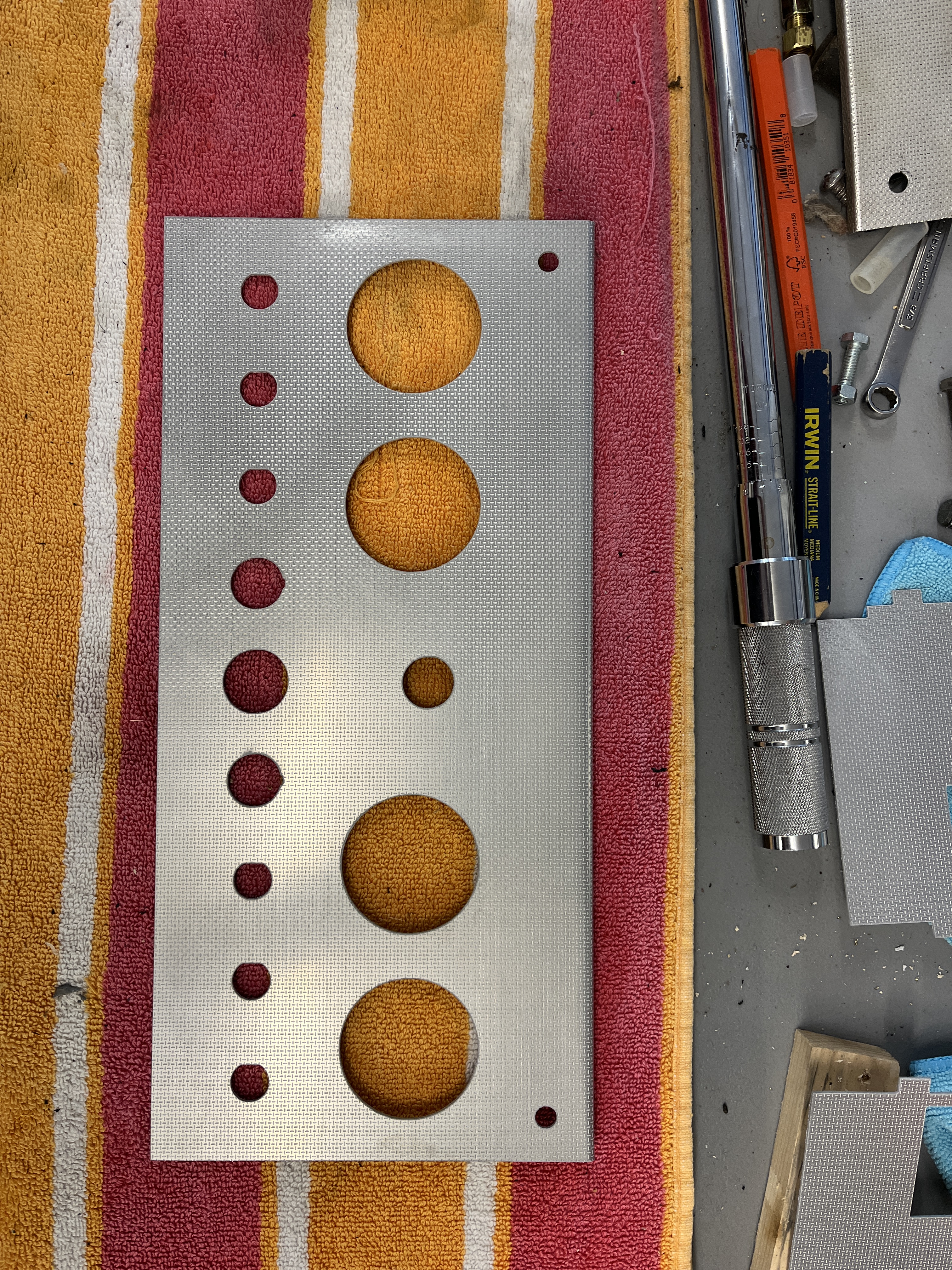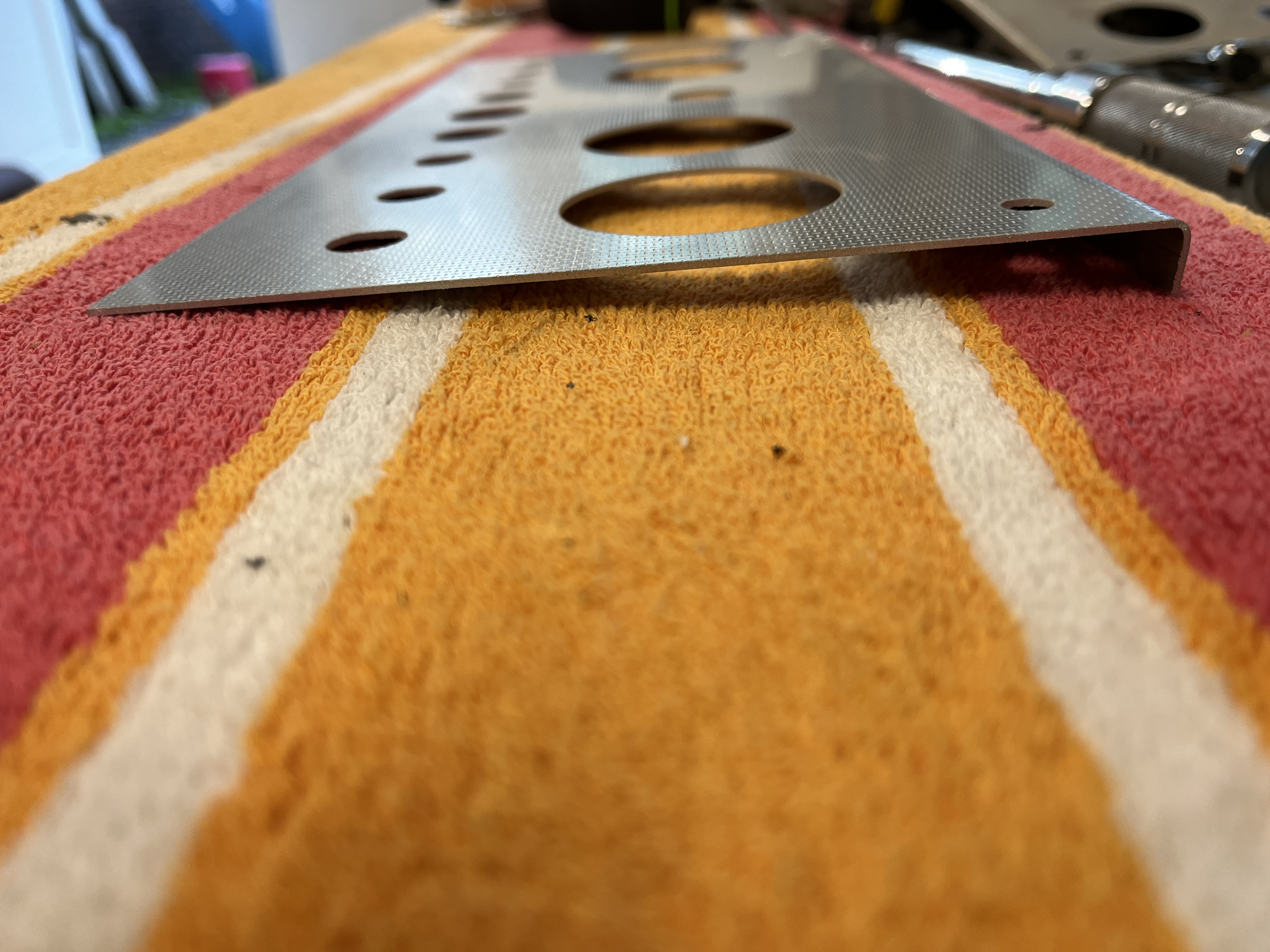 I delivered my precious cross hatch material to the water jet guys and a short while later they called me to say they were done. Ok, show time. I tackled the gauge panel first. Before I could do final fitment, I had to make a 90 degree fold on its top edge. This was done simply with a sandwich of wood and my hammer form tool. Finally, I mated it to the copper panel. It looked really good from a fitment standpoint. I wound up having to file a few holes, really just a matter of a 1/64″ or so. After I got a final fit, I cleaned it up one last time with the aluminum wheel cleaner and sealed it with a coat of Carnauba wax. It was pretty exciting to insert the various switches and gauges. Wow, it looked fantastic!