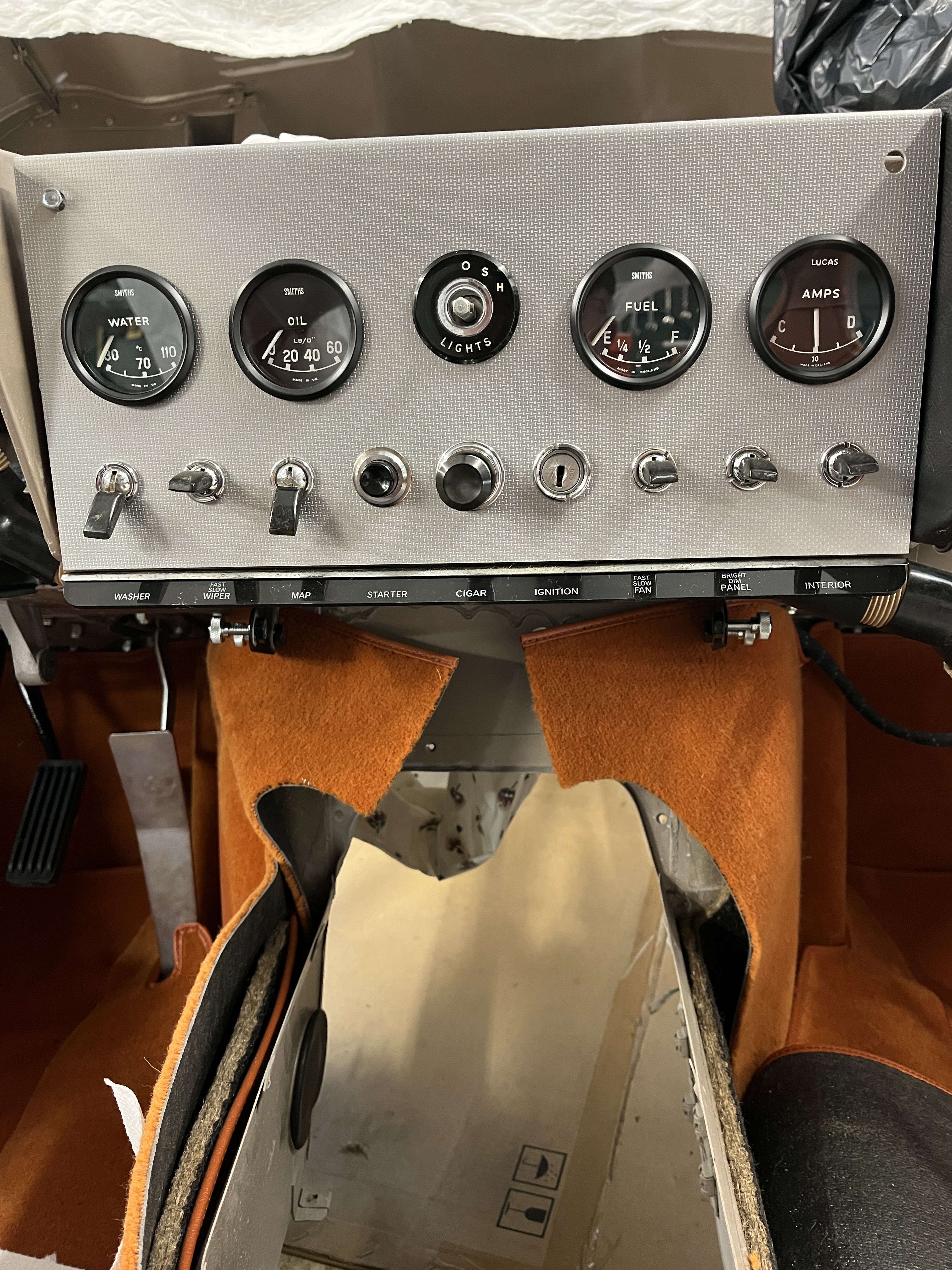 I sent my original pieces to Rick, who precisely measured them and developed a CAD (computer aided drafting) model of the two subject panels. He printed out a full scale pattern on paper, which he overlaid on the original pieces. Perfection but we are talking about Rick, who accepts nothing less! I double checked his work and could find nothing wrong. So he output a CAM (computer aided machining) file and I emailed this to the local water jet cutting firm. They cut test pieces out of plain aluminum. I went to pick these up and test fit against the original pieces. Again, perfection. I should note that logic would dictate that the hole pattern in an Etype gauge panel would be totally uniform and symetric. That was not the case. It was close but when measuring to a tenth inch accuracy, there were small descrepencies. Rick and I decided we had to be faithful to our orignal, which is the copper panel that resides behind the more cosmetic aluminum panel. This turned out to be the right decision, when it came time to fit the gauges and the toggle switches. Another example of how maddening it is to fabricate aftermarket Etype parts for a market greater than one.