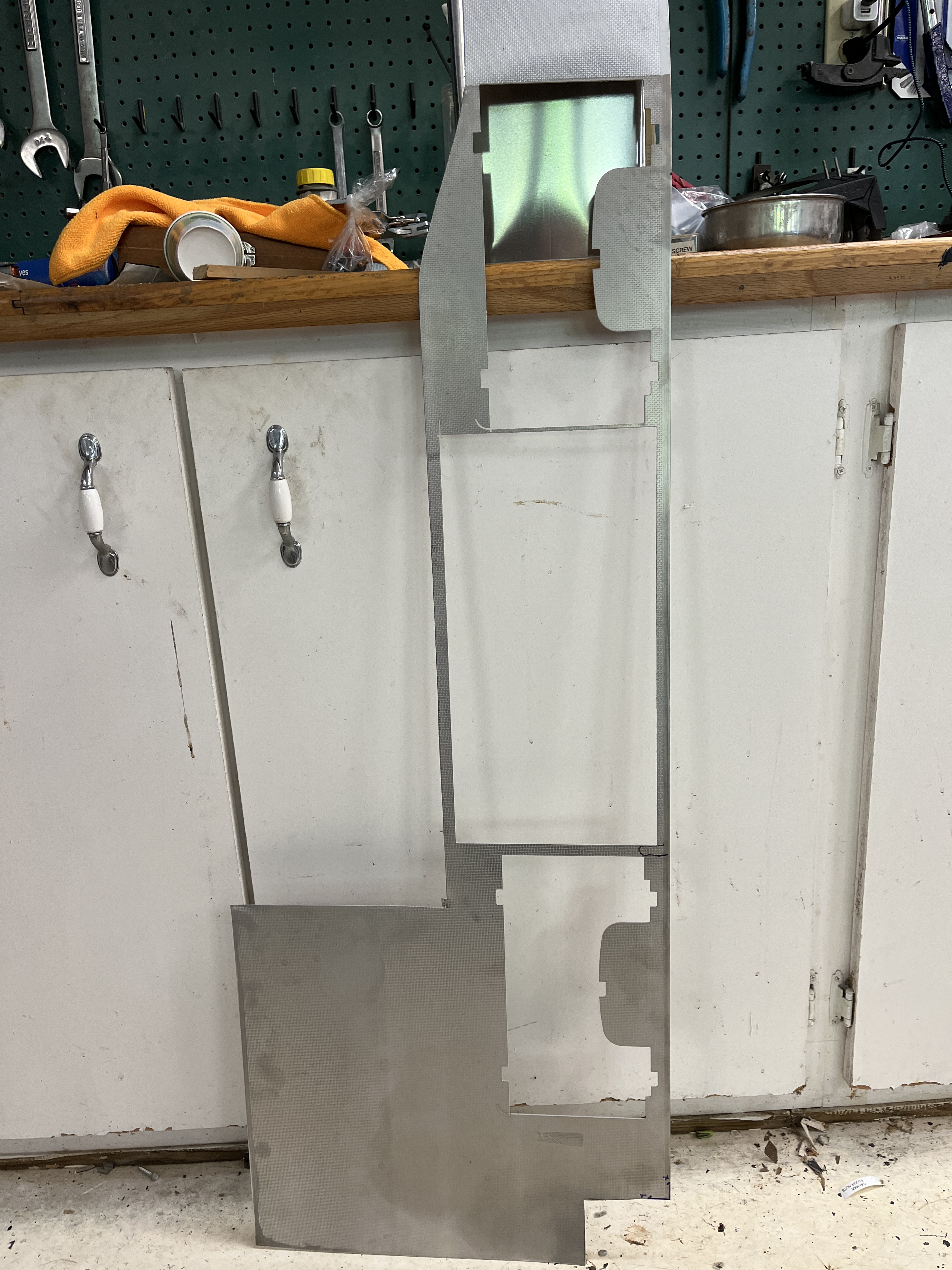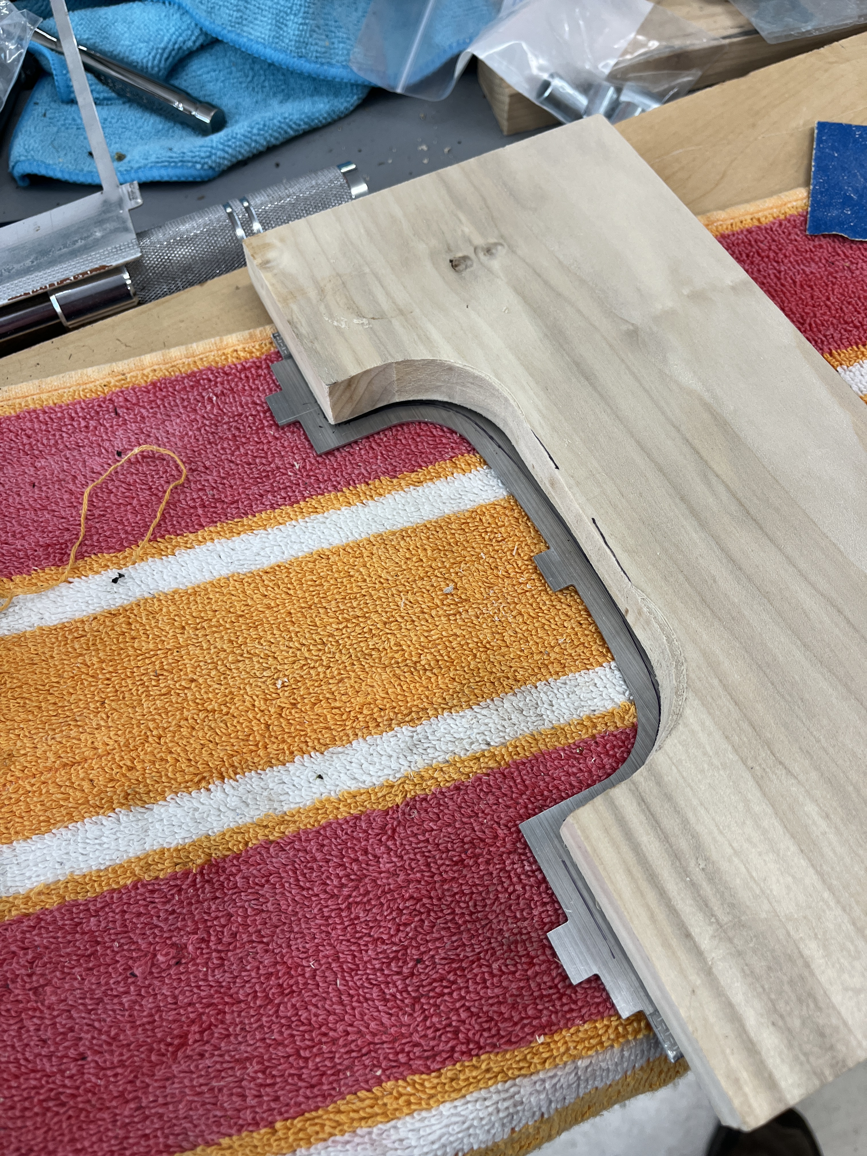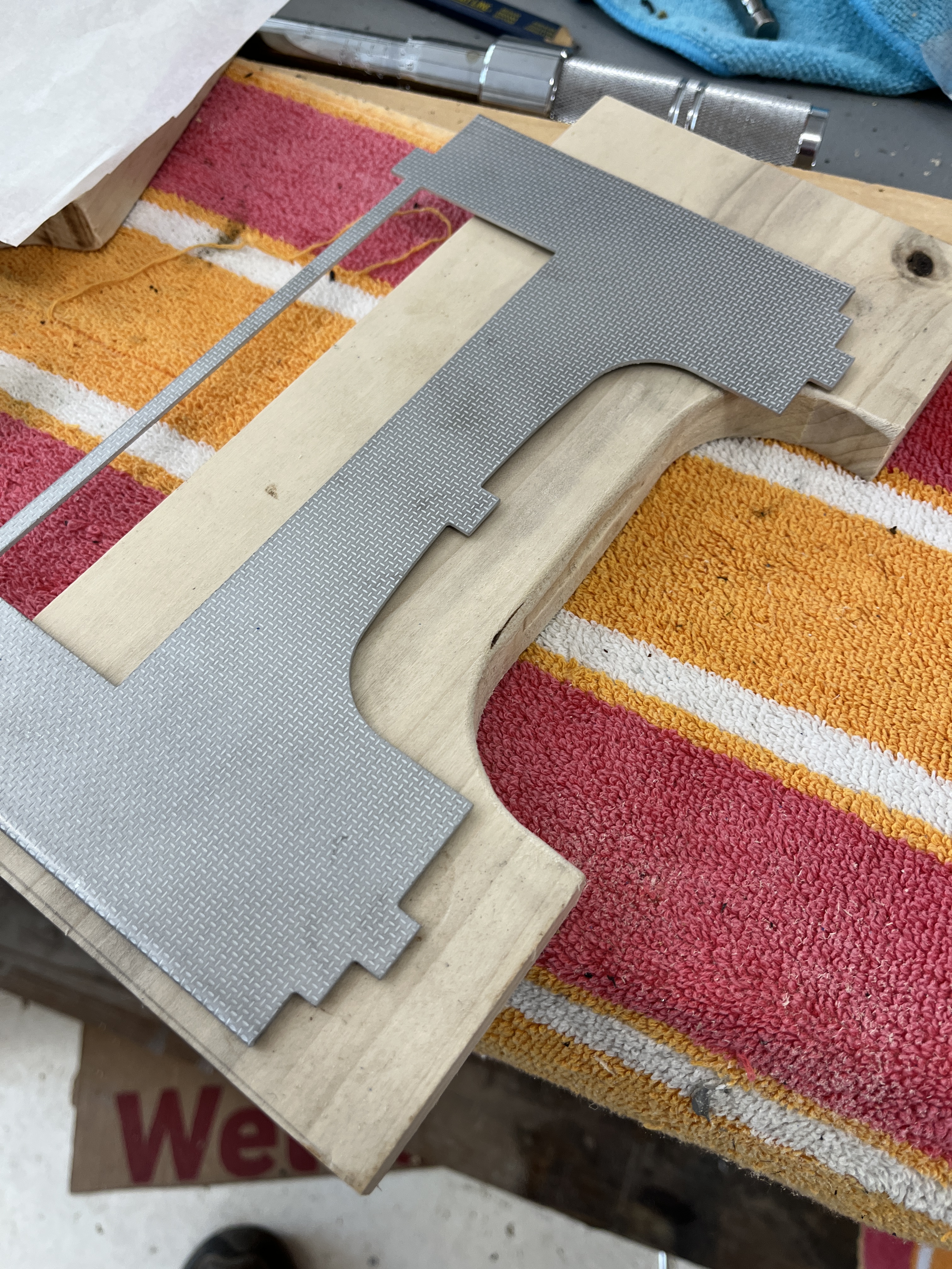 Next I turned my attention to the radio/ash tray panel. This one was more challenging, as it had a rounded opening in it with a 90 degree edge. I used the original to trace out the shape onto a piece of popular wood, which I cut out with a combination of a hole saw and a router. As usual, the opening in my original piece was not a symetric shape. A bandsaw would have been better/easier but the router can be used to “freehand” curved lines. I made two pieces and clamped the aluminum between them. Then I carefully hammer formed the rounded opening. In this case you are making a 3 D shape, which requires bending and stretching of the metal. Being 0.045″ aluminum, it didn’t fight me too much. Finally, I made a 180 degree fold on both sides. Although this piece is basically complete, I am holding off on final assembly. I need the transmission to be installed, so I can work my way out, aligning the various pieces that envelope the shift lever.