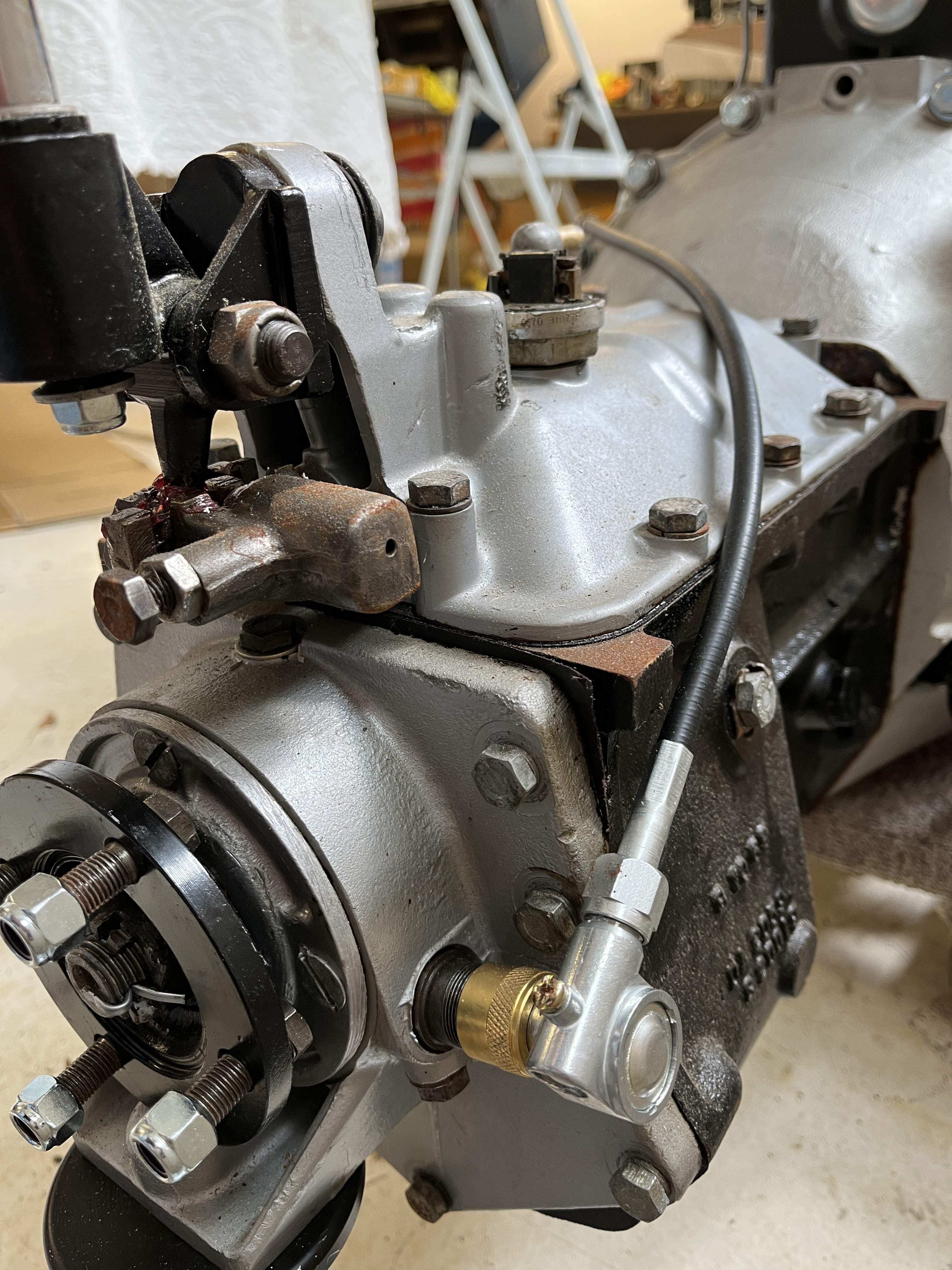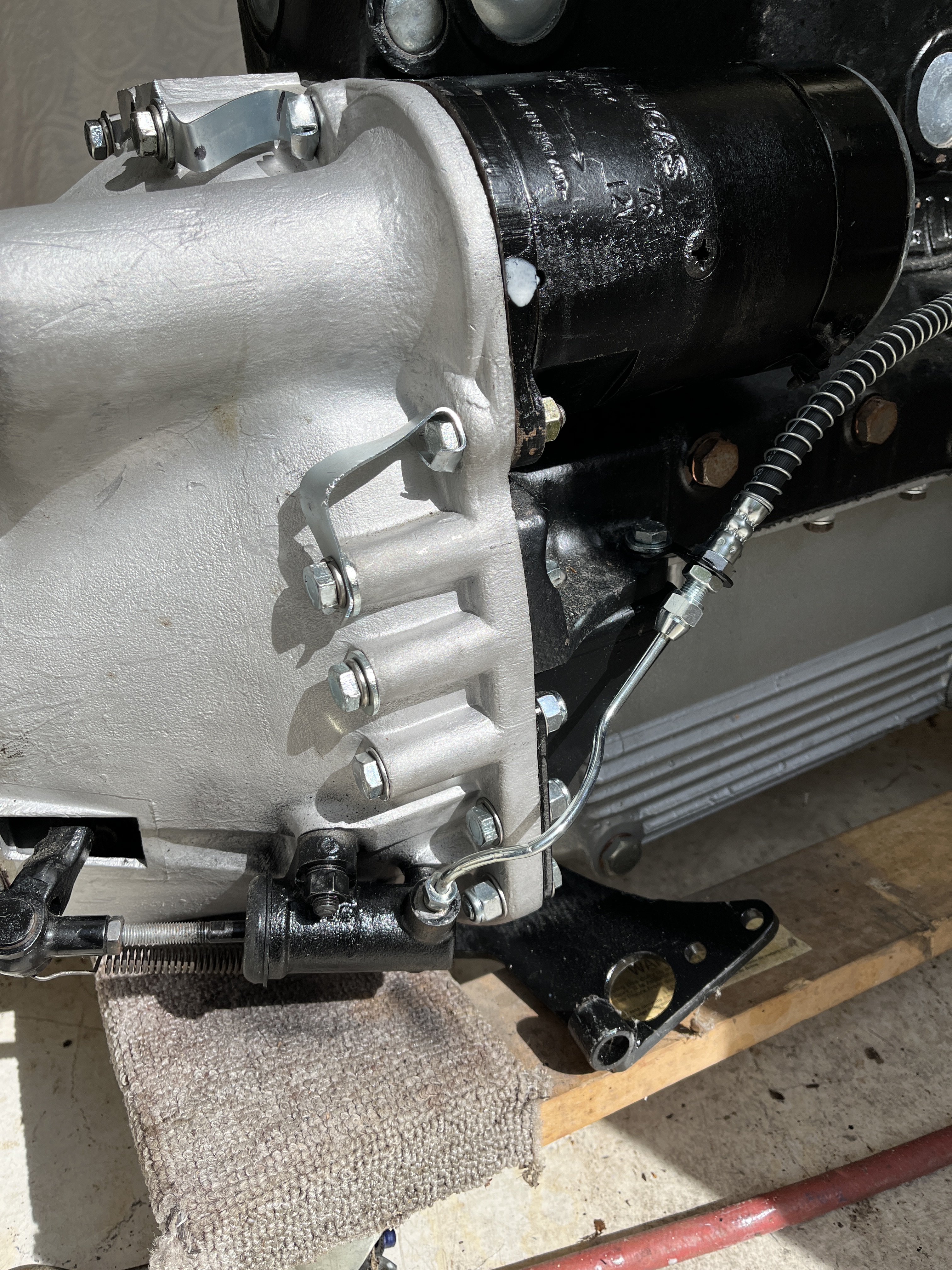 So at first (and this was several weeks ago) I thought, it will be a major milestone to install the engine. Let’s go for it! Then cooler heads prevailed as I thought of all the things that would be much easier with the engine out. Add transmission fluid. Dick coached me to use an “old school” fluid that does not include friction modifiers, which he says will eat up the brass syncros in the tranny. He recommended Redline MT-90, which is what I used. Check. I gathered together the rear mount for the tranny, at least what I had. A review of the Spare Parts Catalogue (SPC) indicated I was missing a number of smaller pieces. An order to SNG solved that. Captive bolt holes in bottom of the body to accept the mount. Chase the threads. Check. Dick had mounted the clutch slave cylinder. I remember I had clearance problems with that item but I am motivated to not disturb Dick’s work until absolutely necessary. I did note that Dick just installed a minimal number of bolts, all modern, to the bellhousing/block interface. I raided my stock of freshly zinc plated original bolts and got everything buttoned up. I noticed a small vent pipe on the top of the tranny. I finally located the associated vent line. Dick confirmed that I can install that after the engine is in. I reviewed the right angle speedometer drive that I had. Broken! Another order to SNG. It has been installed along with a new speedometer cable. I had to hand fabricate the correct clip to attach the cable to one of the bellhousing bolts. That was everything I could see on the tranny. On to the motor.