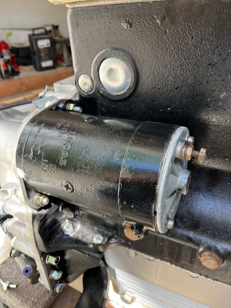 How about the starter? My boxes of parts did not come with a starter or a generator. I purchased a used starter from Dick and a used generator from a local guy. The starter got tested on the car and then detailed. Per the JCNA Series 1 Judging Guide black body with aluminum end plate. A very light bead blast brought the aluminum part, which had been painted black at some point, back to its original glory. The body got some fresh black enamel. The bendix got lubricated. It is not original but I am going to fabricate pieces to hold the bolts from turning at the back side.