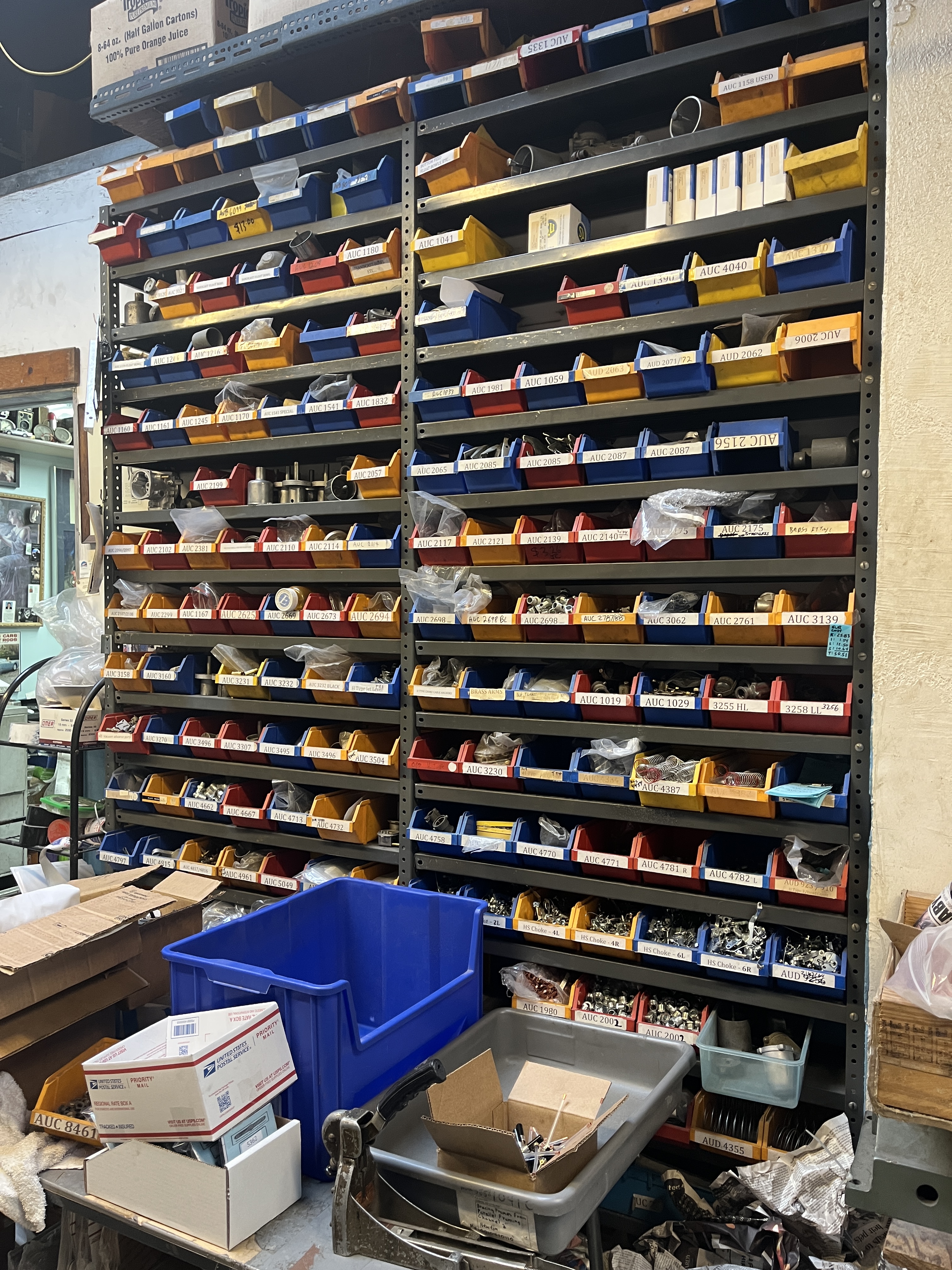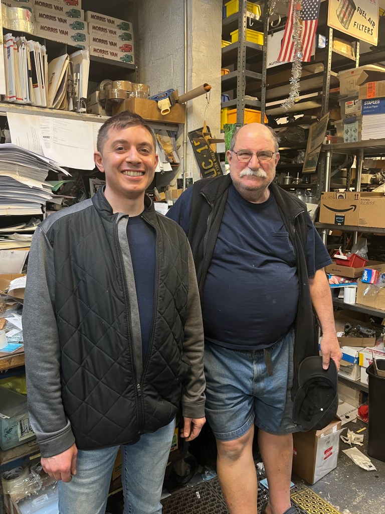 Anyway, I found on street parking and walked back to the address. The door was locked but there was a doorbell. I rang it and shortly the door opened and there he was. Joe Curto. Since he knew I was coming, he immediately invited me in. We walked through a big crowded unheated space to his inner sanctum, which is a small crowded heated space! After a few introductory pleasantries (“Rain is coming Joe. I drove through it all the way up I-95”) we got into it. “How long have you been doing this Joe? Well, I bought an MG-TD when I got out of the service and it had SU carburators and since I didn’t have any money, I had to learn how to do everything myself.” And that apparantly became a side business. “British sports cars were very popular around here at that time”, which grew into a full time business that is still going strong today. I’m not sure if there is a succesion plan but I did meet Chris, who may or may not be taking over someday.