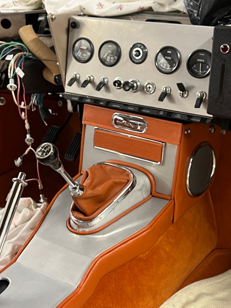 It is a well known problem with the Etype that if you don’t get things right, it is difficult, if not impossible, to get the center gauge panel to rotate down and allow access to the fuses. I had learned on my 2+2 restoration that modifications to the various parts may be required. In the last article, I had fitted gauges into the gauge panel and set it on its pivot points. There is basically zero adjustment vertically of the gauge panel. What really sets the end result is the vertical position of the center console. I probably did trial fitment of the various parts several dozen times. Without the fibreglass transmission cover installed, everything looked pretty good. But as soon as I installed the transmission cover, the center console would not seat low enough. The difference was probably only 1/2″ but that was a 1/2″ too far. The gauge panel would not rotate down. I looked at the various factors and decided I was going to have to remove material from the transmission cover. Basically, everything rearward of the shift lever was too high and had to go. So I cut it away. After that, the height values worked to let the gauge panel open. In order to keep heat and noise out of the cockpit, I fabricated an aluminum piece to replace the part I cut out. And I inserted generous amounts of foam insulation. I’m not going to post a picture because it is butt ugly but it is functional, so that is what counts.