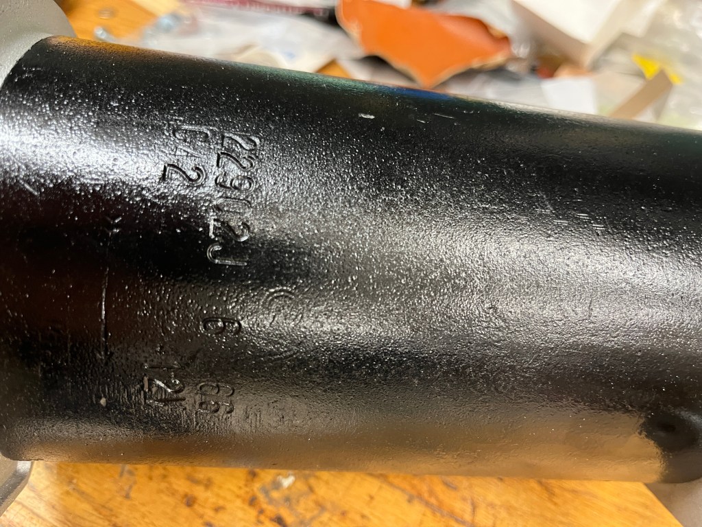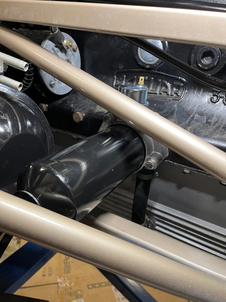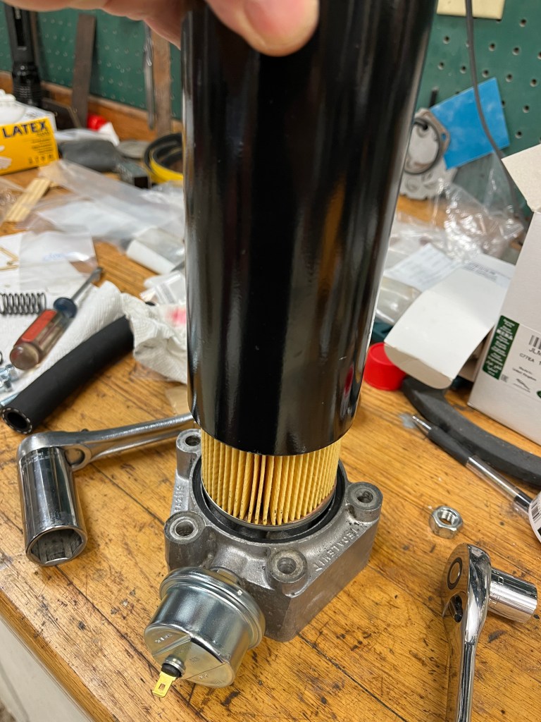 Oil Filter– the oil filter is a cannister type, with a paper filter inside. It is a little messy to replace but it is authentic. The filter canister mounts to an casting that bolts to the side of the block. It is slightly complex internally, as it supplies oil to and from the filter, it has a bypass for a clogged filter, and it provides an overpressure relief path back to the sump i.e. an oil pressure relief valve. I replaced the spring on the valve and all the basic gaskets. More black enamel paint was applied to the cannister. The sending unit for the oil pressure gauge is also plumbed in here. BTW, the “engine number” is stamped into the block just above the oil filter.