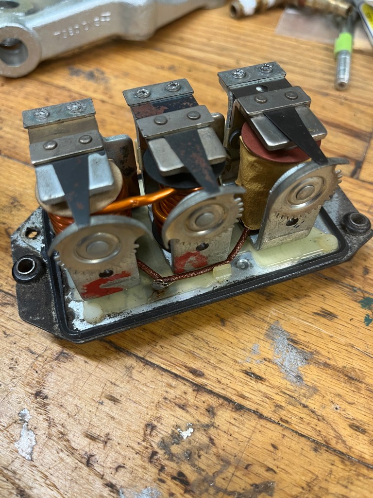 Voltage Regulator– To make the generator work, you need a voltage regulator. Generators are dumb beasts. The harder you work them, the more they produce. This quest for higher and higher output voltage can be destructive to components. Thus the need for a voltage regulator. It does what it’s name implies. In a rather clunky steampunk way. When the voltage gets too high, a magnetically driven contact opens and shuts down the generator. The voltage drops. The contact opens. And back and forth, maintaining an output that is roughly 12 volts, plus or minus. The battery helps smooth all this out. Anyway, my box of parts included a voltage regulator that had the correct part numbers. When I opened it up, it looked pristine inside. Hopefully, it will work as advertised.