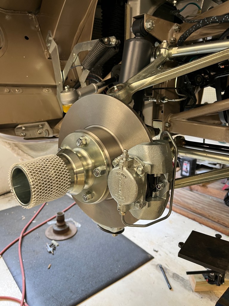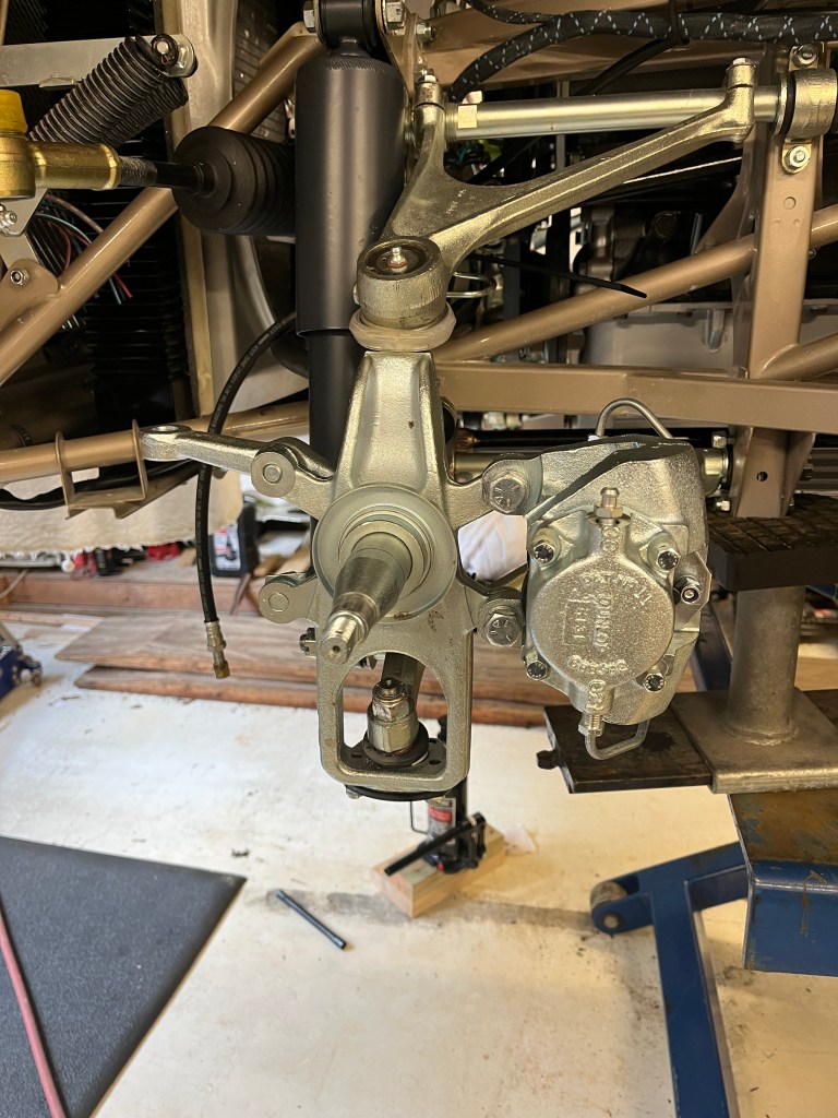 This is a shot you won’t often see. Shown is the “stub axle” where I am testing fitting the inner and outer hub bearings. They are a slip fit on the stub axle. The stub axle is supported by the “stub axle carrier”. It has ball joints on its lower and upper ends. These attach the the lower and upper A-arms. The carrier also provides a mounting point for the brake caliper. In this photo, things are just loosely fit as I determine what parts and hardware that I am missing.