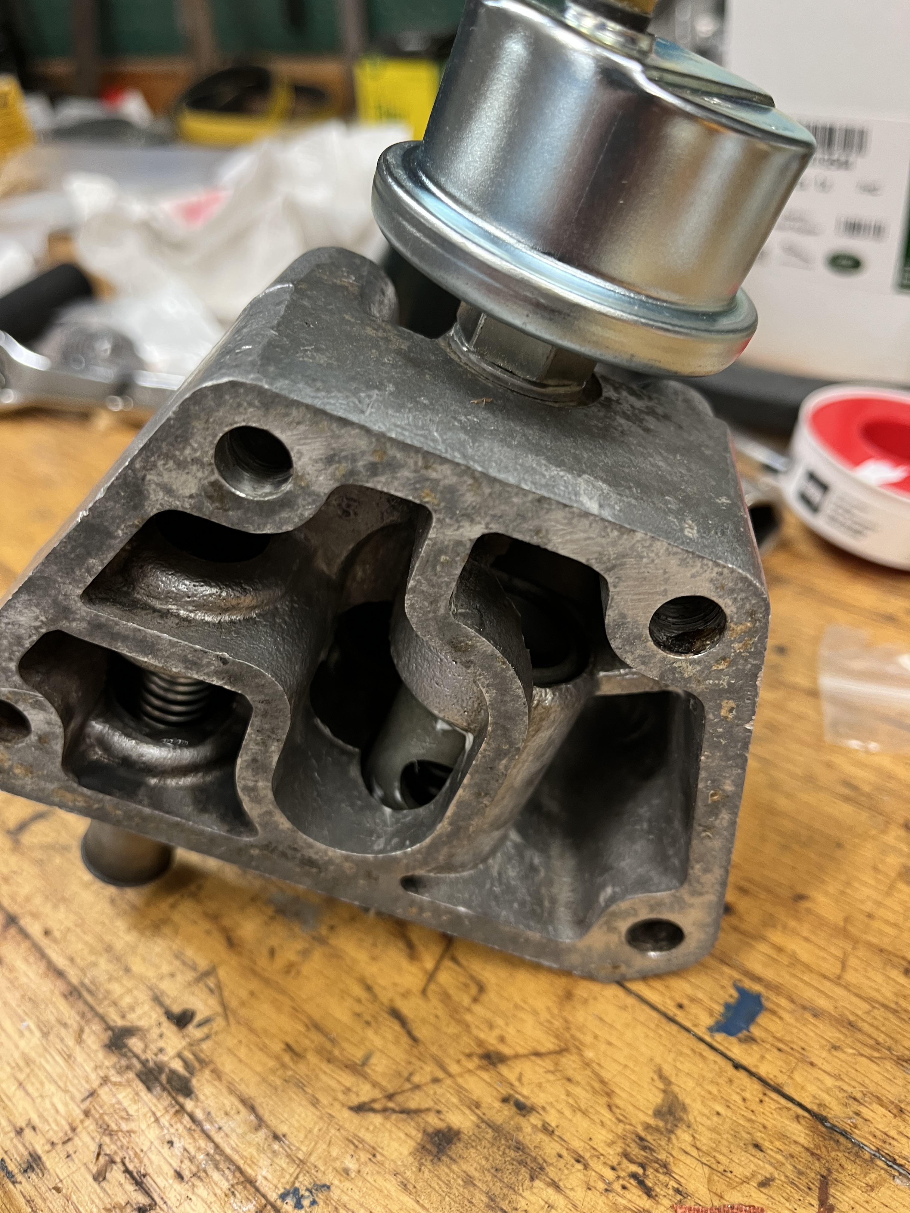 Oil Filter– the oil filter is a cannister type, with a paper filter inside. It is a little messy to replace but it is authentic. The filter canister mounts to an casting that bolts to the side of the block. It is slightly complex internally, as it supplies oil to and from the filter, it has a bypass for a clogged filter, and it provides an overpressure relief path back to the sump i.e. an oil pressure relief valve. I replaced the spring on the valve and all the basic gaskets. More black enamel paint was applied to the cannister. The sending unit for the oil pressure gauge is also plumbed in here. BTW, the “engine number” is stamped into the block just above the oil filter.