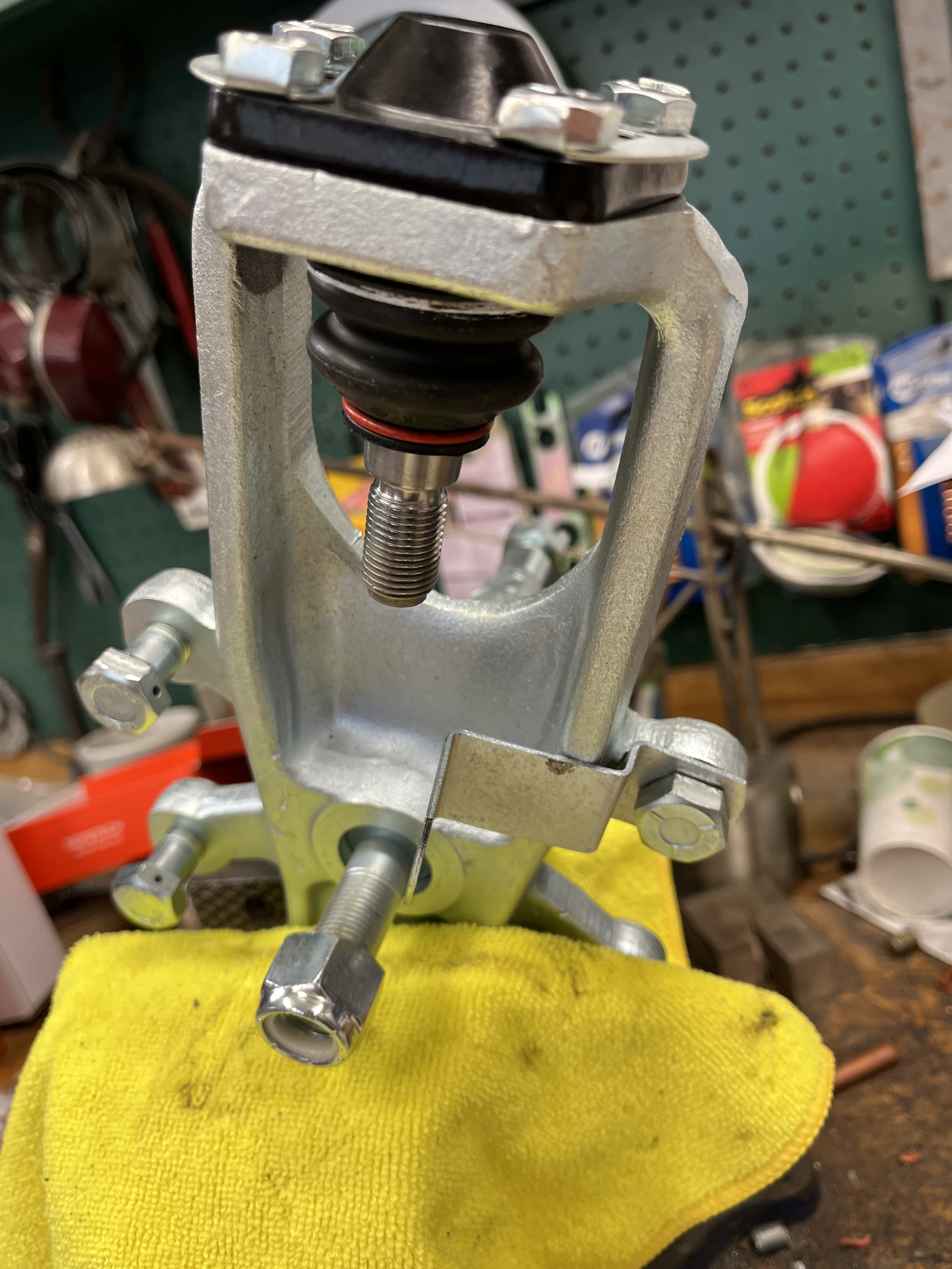 This is a shot you won’t often see. Shown is the “stub axle” where I am testing fitting the inner and outer hub bearings. They are a slip fit on the stub axle. The stub axle is supported by the “stub axle carrier”. It has ball joints on its lower and upper ends. These attach the the lower and upper A-arms. The carrier also provides a mounting point for the brake caliper. In this photo, things are just loosely fit as I determine what parts and hardware that I am missing.