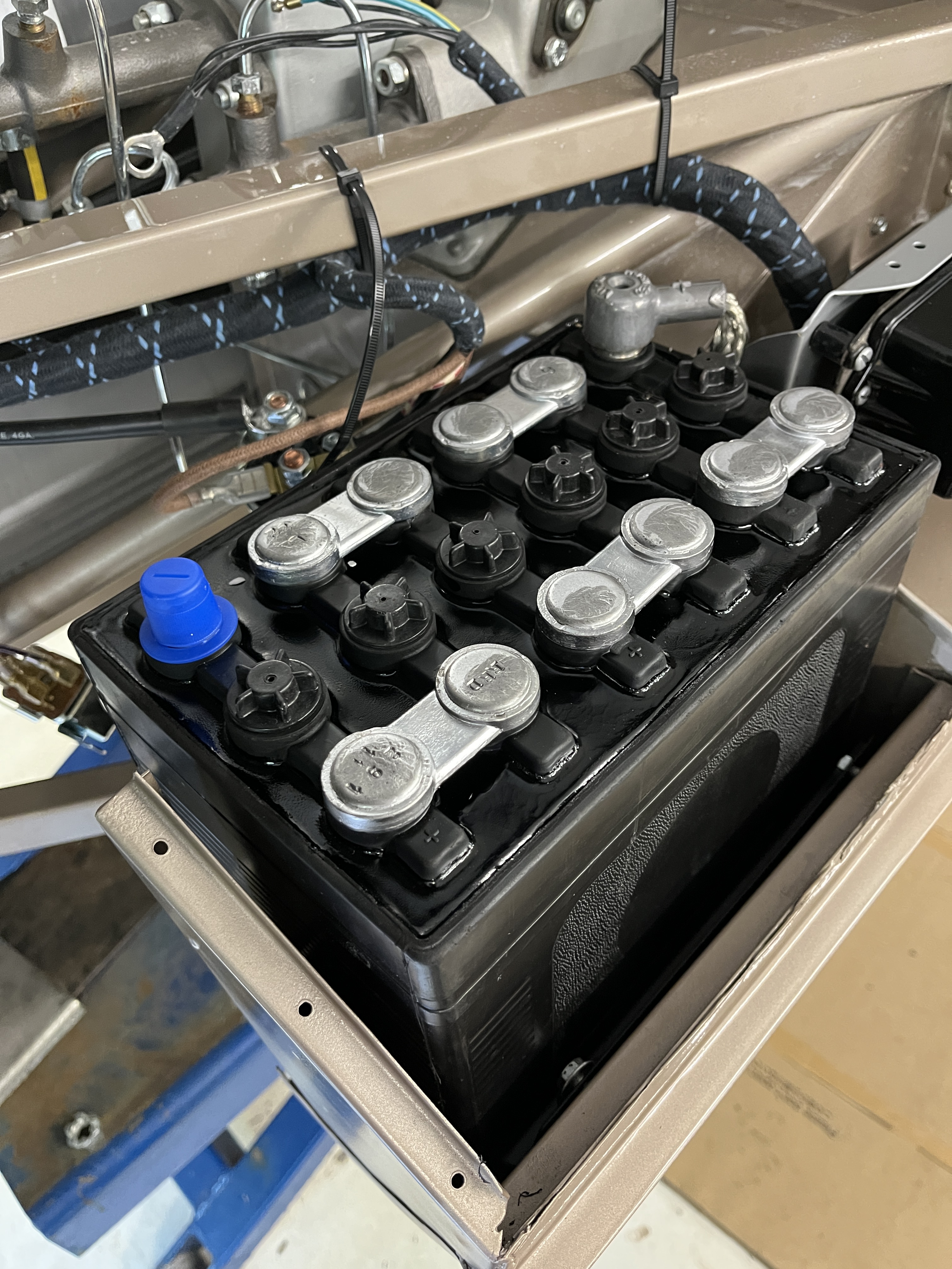 Battery– Speaking of batteries, I purchased an old school look battery from SNG. In hindsight 55 years later, the exposed metal terminals between the cells does not seem to be a good idea but that is how they did it back then. SNG ships this one dry and you add the electrolyte yourself. The electrolyte is available locally. At this point I am just test fitting it, dry.
