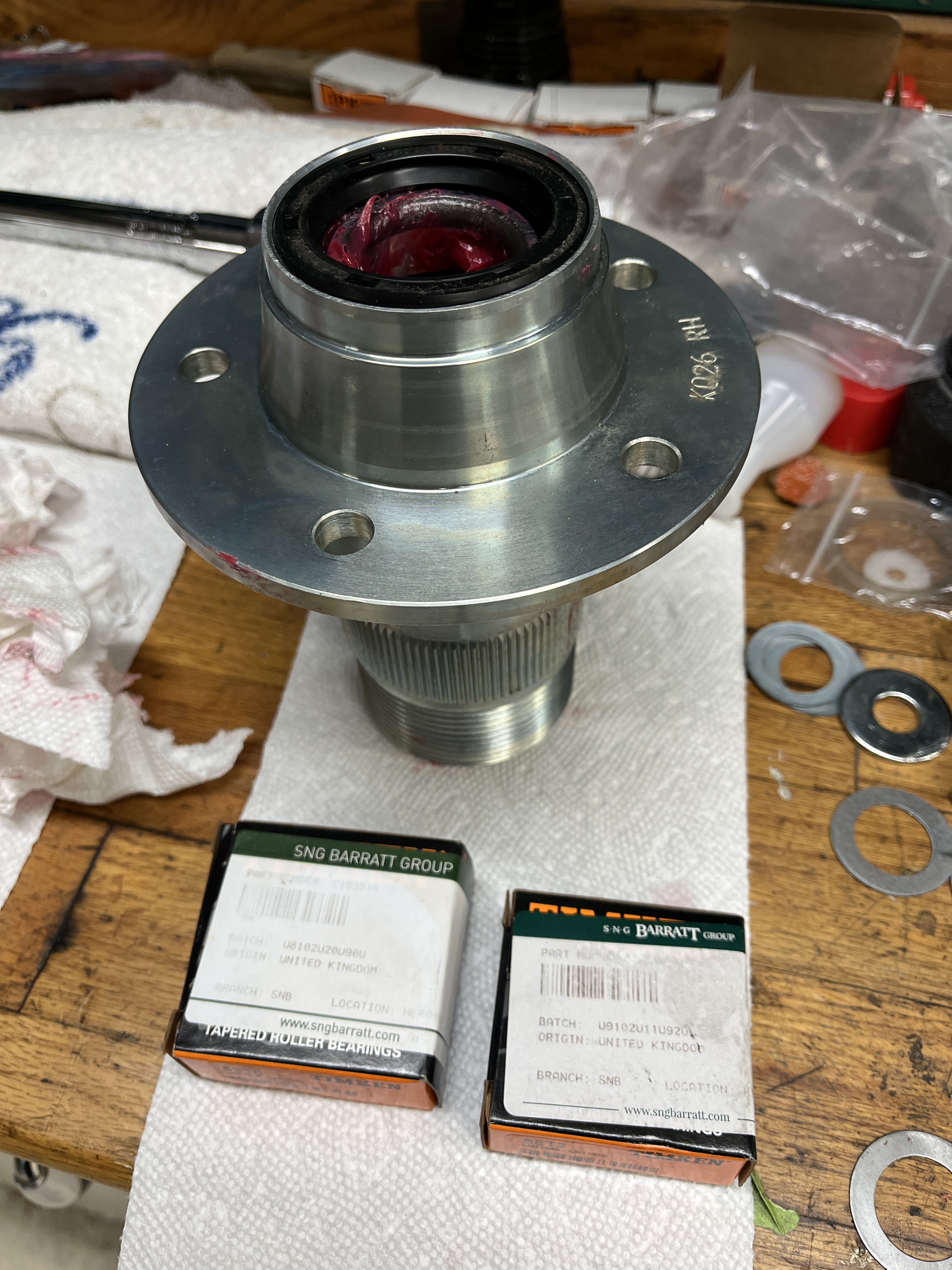 Here is a photo of the new splined hub. The splines that engage the wire wheels get worn so it is best to replace them. Plus, it is easier to press the races for the new wheel bearings into new hubs.