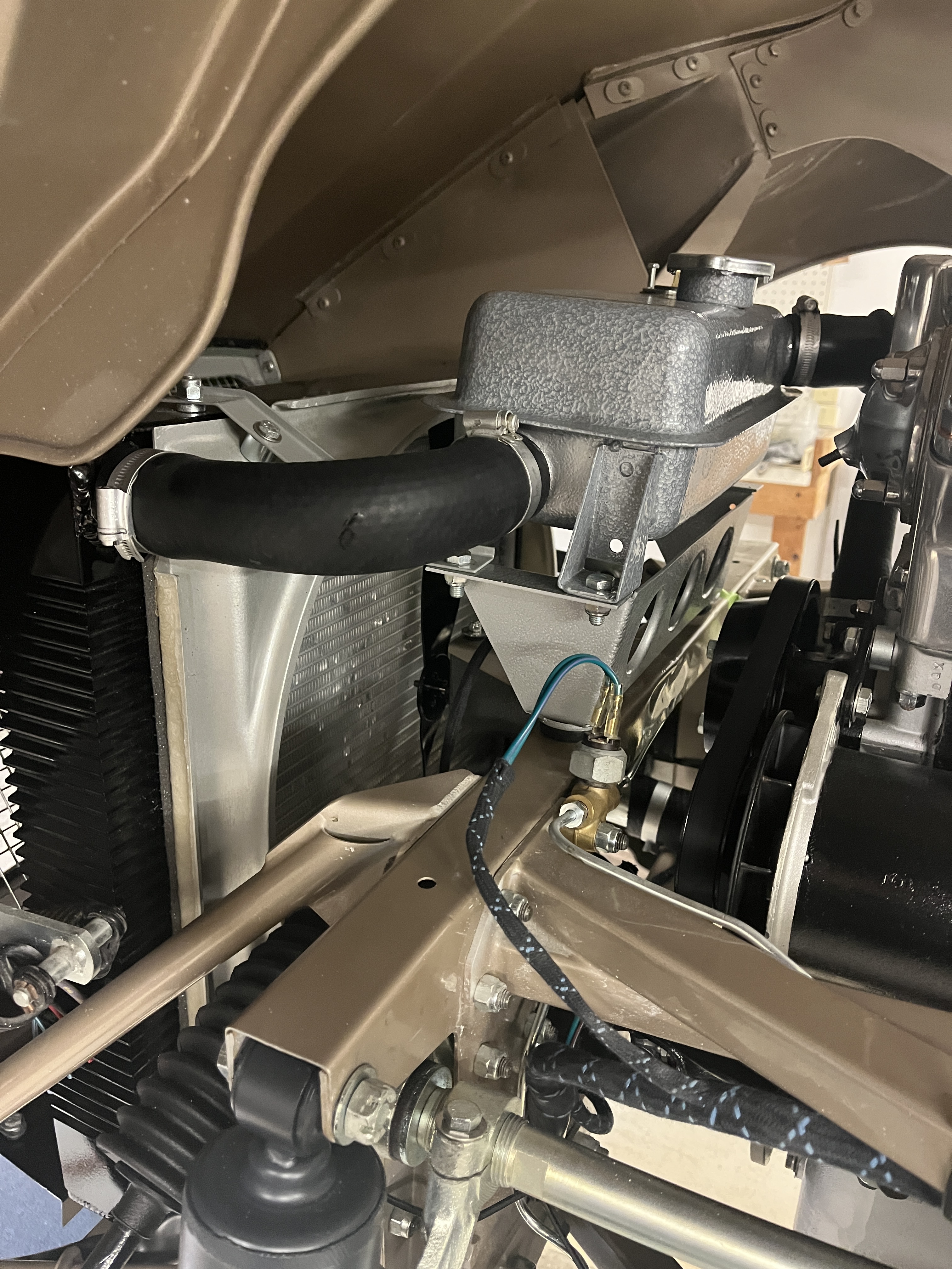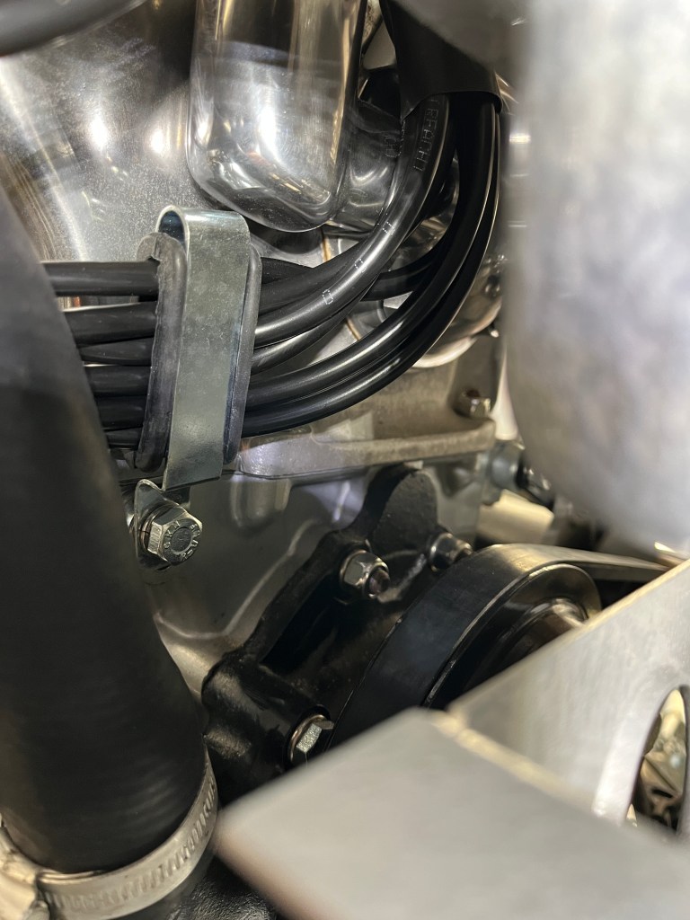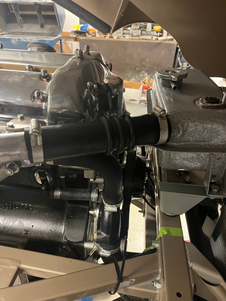 Another job I did before access got tight was to install the various coolant hoses and the thermostat housing. I used my stock of genuine Cheney clamps purchased on Ebay from Maurys Garage. As others will testify to, these do not inspire confidence but they are concours correct so we will see if they can hold pressure when I put the engine into service.