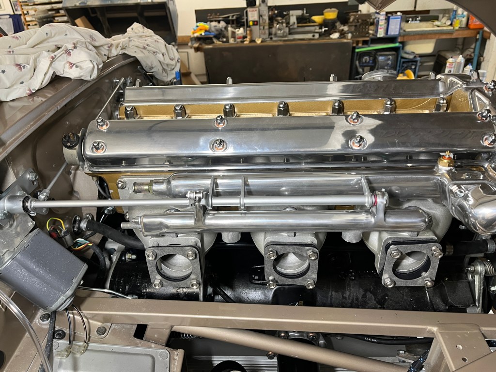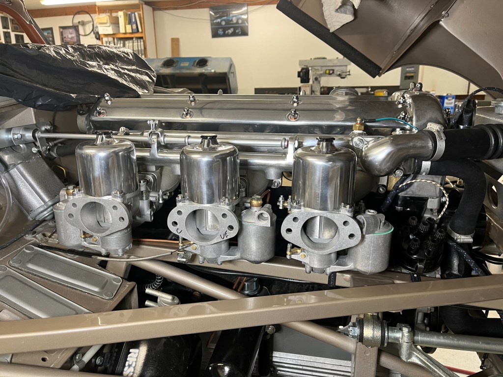 As many of you will know, the Series 1 Etype was fitted with three SU (Skinners Union) carbs. Much has been written about the SU carb design, which is ubiquitous on English cars of that era, similar to Weber carbs being used on Italian cars. Google “constant depression carb” for more technical details. The displacement of the Etype at 3.8 litres just barely warranted 3 carbs versus 2 but this is probably a case where the marketing department overrode the bean counters.