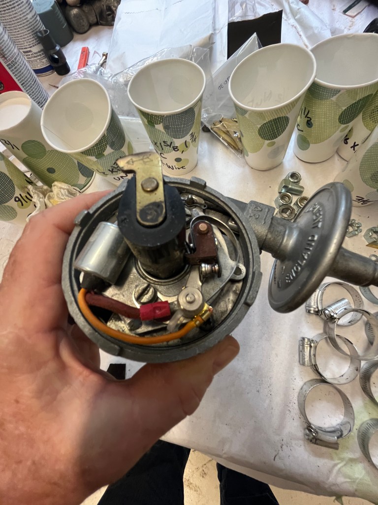 The distributor was rebuilt and tested by Dick Maury. I installed it into the block, where a cog engages to drive it at 1/2 of the crankshaft speed. The distributor includes a centrifugal advance unit was well as a vacuum advance. The centrifugal unit advances the spark with increasing rpm’s of the engine. The vacuum unit advances the spark at “light throttle”, which is basically a fuel economy measure.