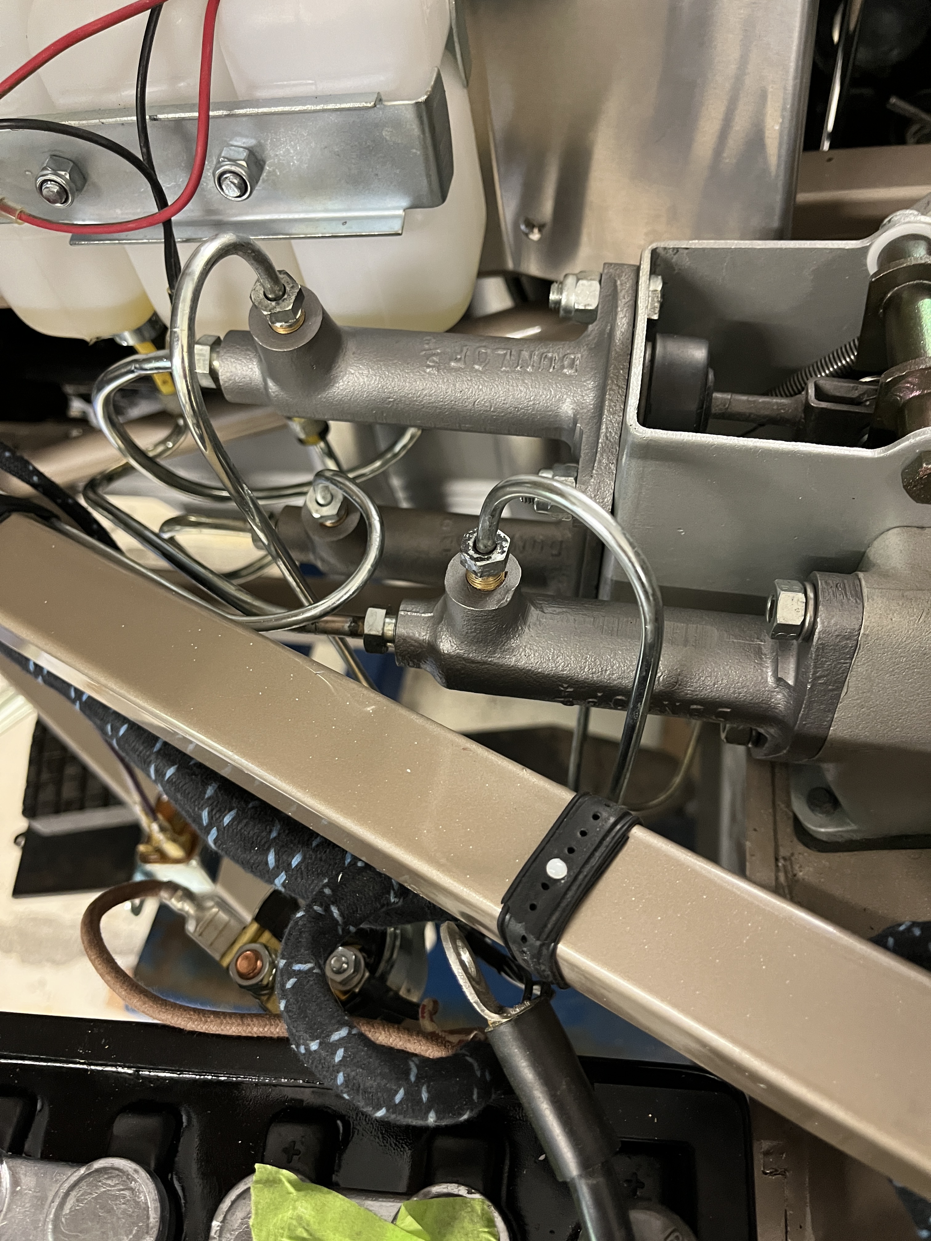 Last but not least, I had to deal with a situation on my brake and clutch master cylinders. I had sent them to White Post Restorations to be sleeved and new rubber parts installed. They painted the exteriors with a rather pedestrian grey paint. The JCNA Autenticity Guide states that a “Clutch & brake cylinders have a natural cast iron finish”. Well, the natural state of cast iron is rust but clearly that is not what we are looking for. After some research, I decided to bead blast the cylinders and seal the unprotected cast iron surface with a product called ACF-50. It is not a “lifetime” solution but the corrosion protection of the ACF-50 is said to measure in years, not months. Time will tell. BTW, a small detail evident in this photo. If you follow the SPC closely, it calls for self-locking nuts on the brake master cylinders but standard nuts with a clockwasher on the clutch master cylinder. Go figure!