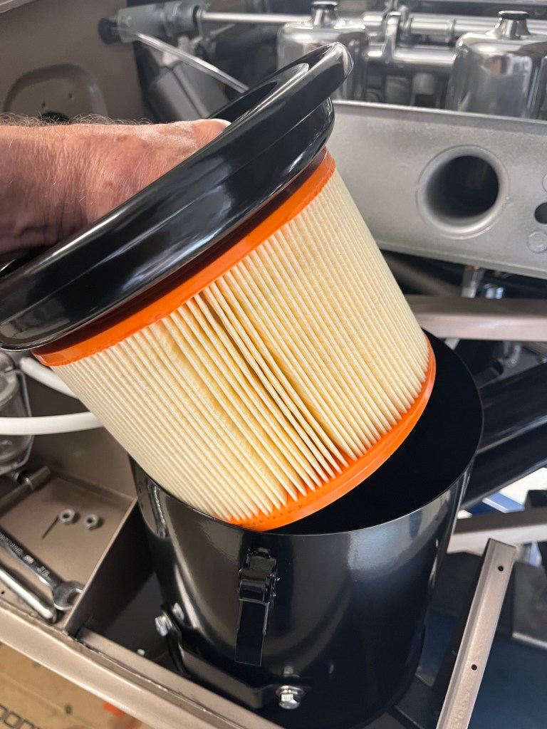 After I got the carbs squared away, it was time to look at the air filter assembly. Some research on the UK Factory Fit forum indicated that some of the components I had on hand were not correct or complete. The most glaring issue was the triangular air intake assembly. In the summer of 1963, cars were noted with 3 “grooves” in the top of this piece but before that they were flat topped. An educated guess is that the flat top assembly was prone to cracking or outright collapse. Regardless, the piece I had on hand from my “box of parts” had the grooves, which would be incorrect for my January 2nd, 1963 build date. Additionally, the round canister that holds the paper filter assembly was missing its internal parts. Fortunately, SNG sells very nice reproductions of both of these parts. BTW, the correct finishes are black for the round canister and silver Hammerite for the triangular plenum. I was able to use my existing “trumpet assembly” which externally has 3 tubes and that internally has “velocity stack” entrances to the 3 tubes, which adds a modicum of performance at high rpms. Even better was the fact that a standard Rustoleum Silver Hammerite was an excellent match to the finish on the SNG part. Once I had these parts on hand, it was mainly a matter of reviewing the SPC for the correct fasteners and hooking everything up. BTW when the bonnet is closed, those 2 “snorkles” line up with the outlet of the fresh air intake on the right hand side of the bonnet, delivering relatively cool air to the carbs.