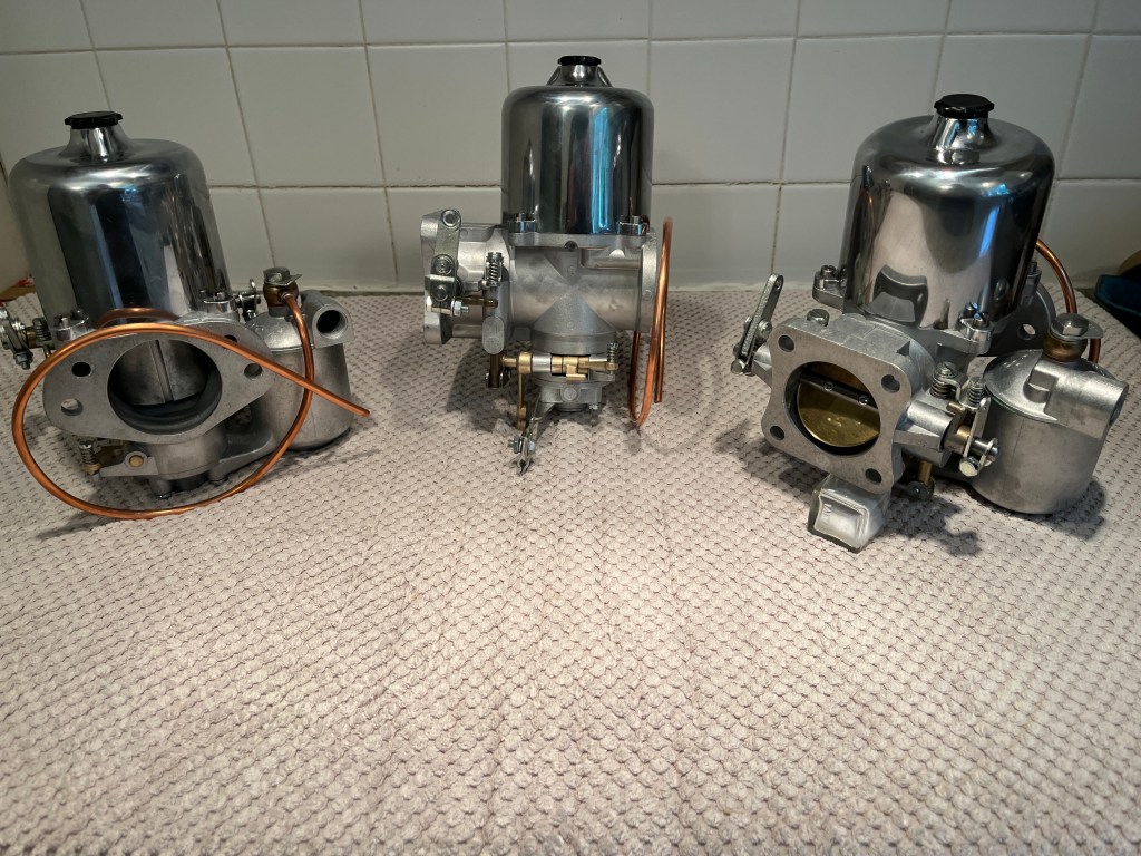 Last but not least, the condition of the SU carbs can play a big part in how well your overall linkage responds to throttle inputs. Here are 3 freshly rebuilt by Joe Curto SU carbs for my 3.8 car. On the right hand carb you can see the “butterfly” which is at the end of this long path of linkages. As the butterfly rotates, it allows more airflow. The SU carb cleverly takes care of adding the additional gasoline required to allow your engine to rev. Google “constant depression carburator”. Anyway, the shaft that the butterfly rides on must be in good condition or it can bind. Joe Curto offers a rebuilding service for just the throttle shafts at a reasonable price. These carbs have received his full restoration service and are a joy to look at.