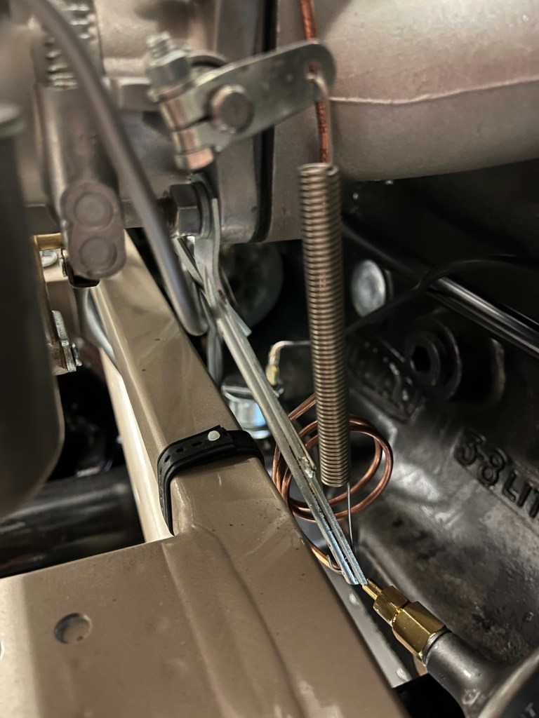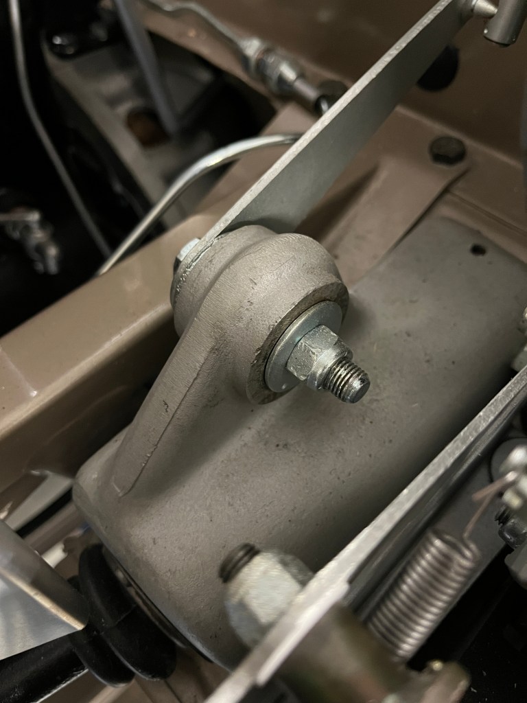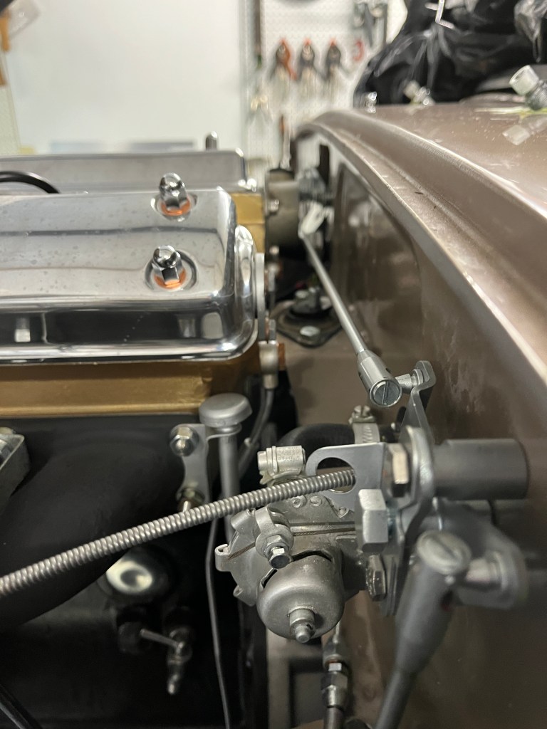 I’m sure the designer had a need for this strange little connection but that need is lost in antiquity. As the mechanism gets some miles on it, I have found that the pieces get “beat up”. New ones might be in order as a routine wear item. Also visible in this picture are the L shaped rods that reach down to the throttle shafts on the carbs. They are held in place with the little black clips. Getting your fingers in there to remove and install these can be a trick. Make sure the clips haven’t been mangled, as that can introduction “stiction”.